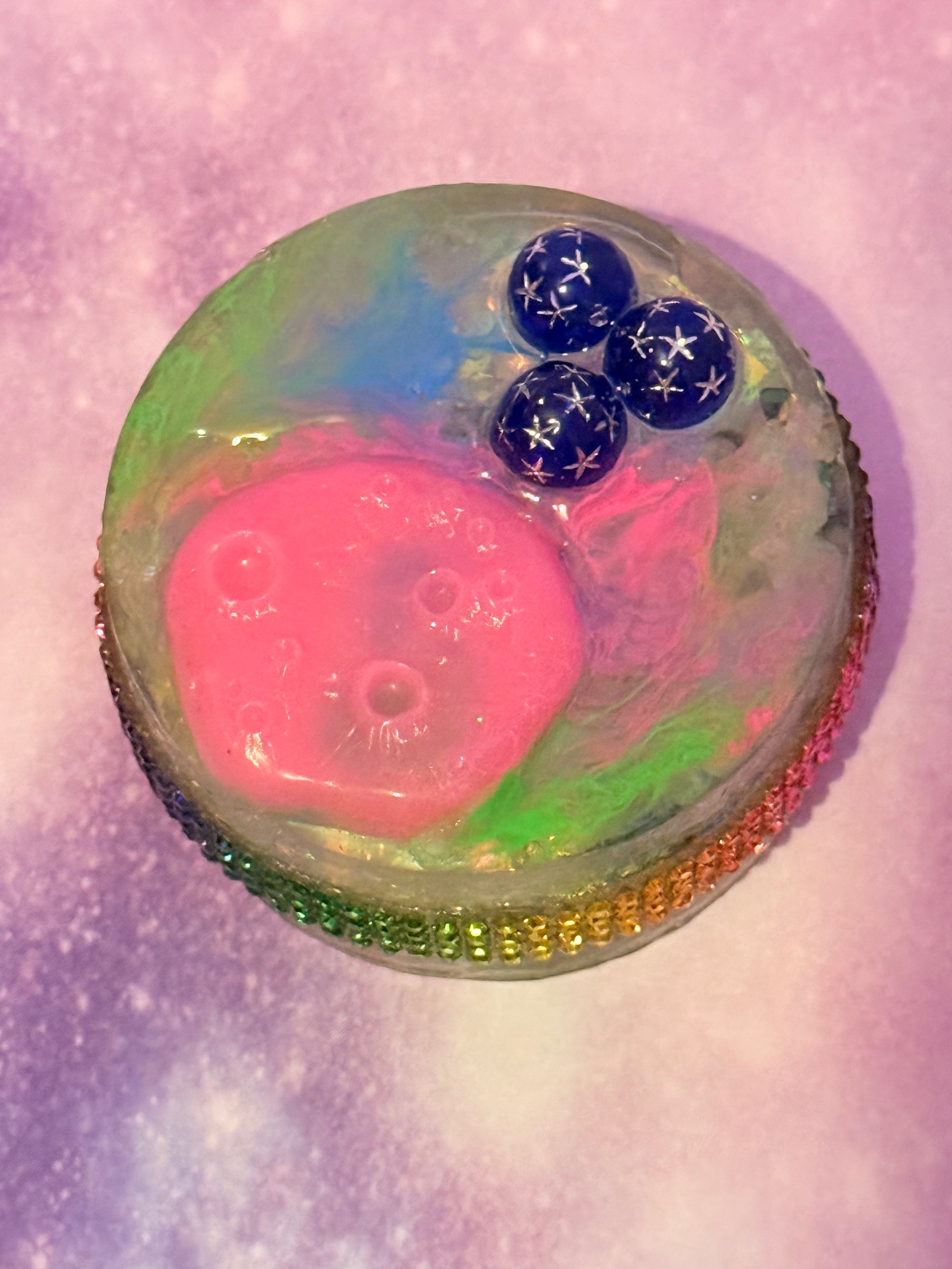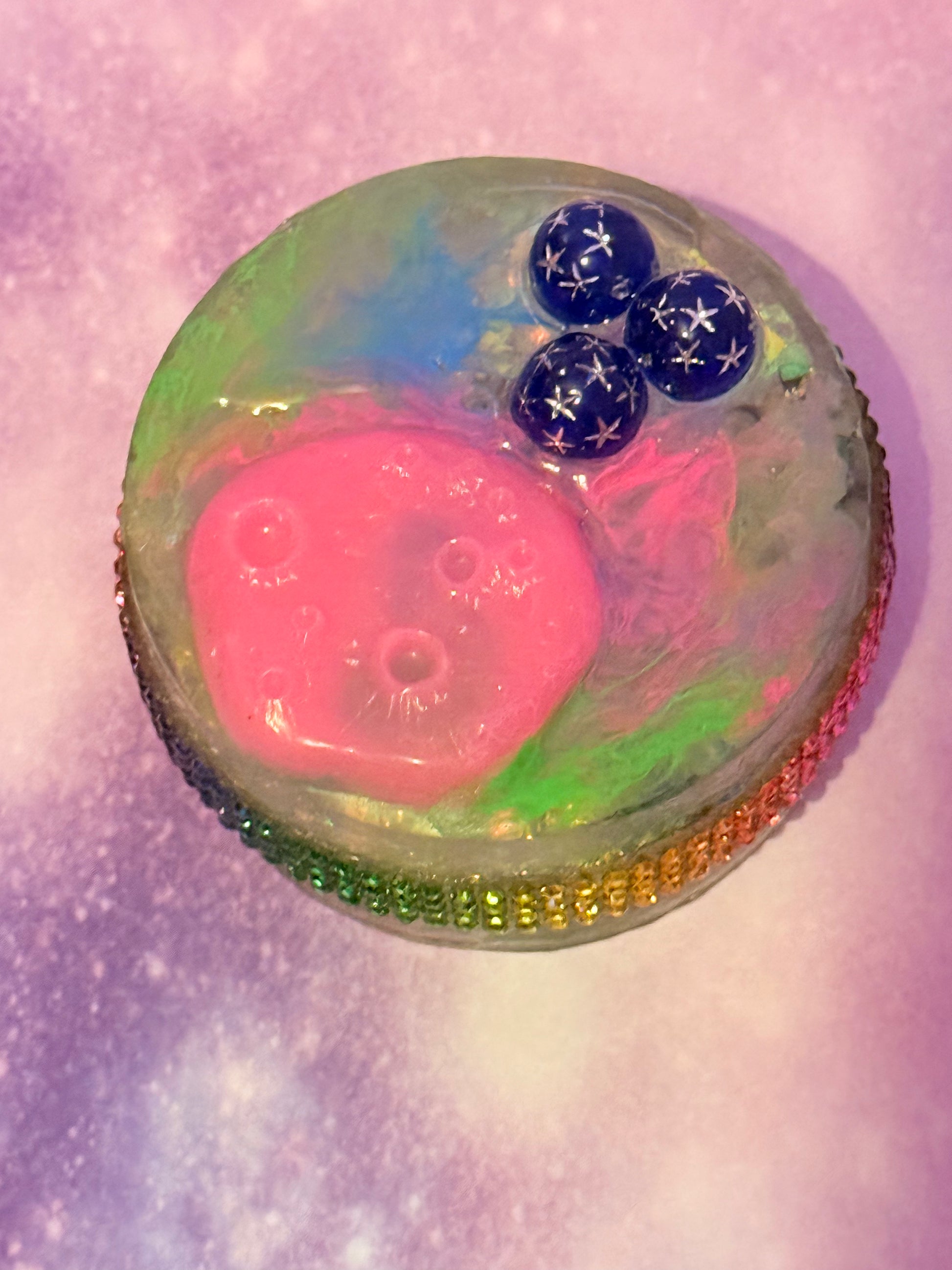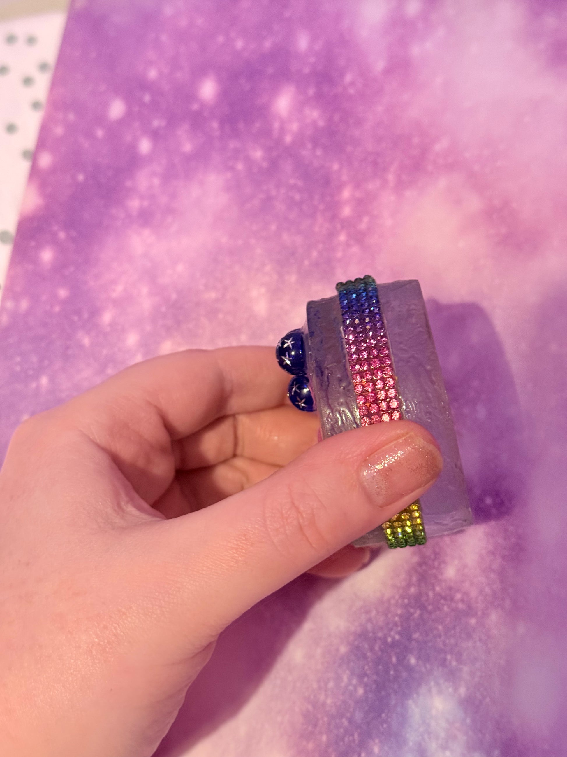 This tool features a gem grip around the edges, making it very satisfying to squeeze. The back of this one features a textured moon and raised galaxy beads. It’s also decorated with neon colours to resemble a nebula.