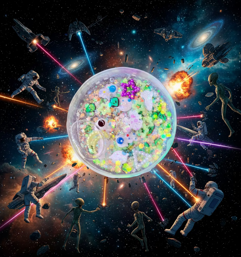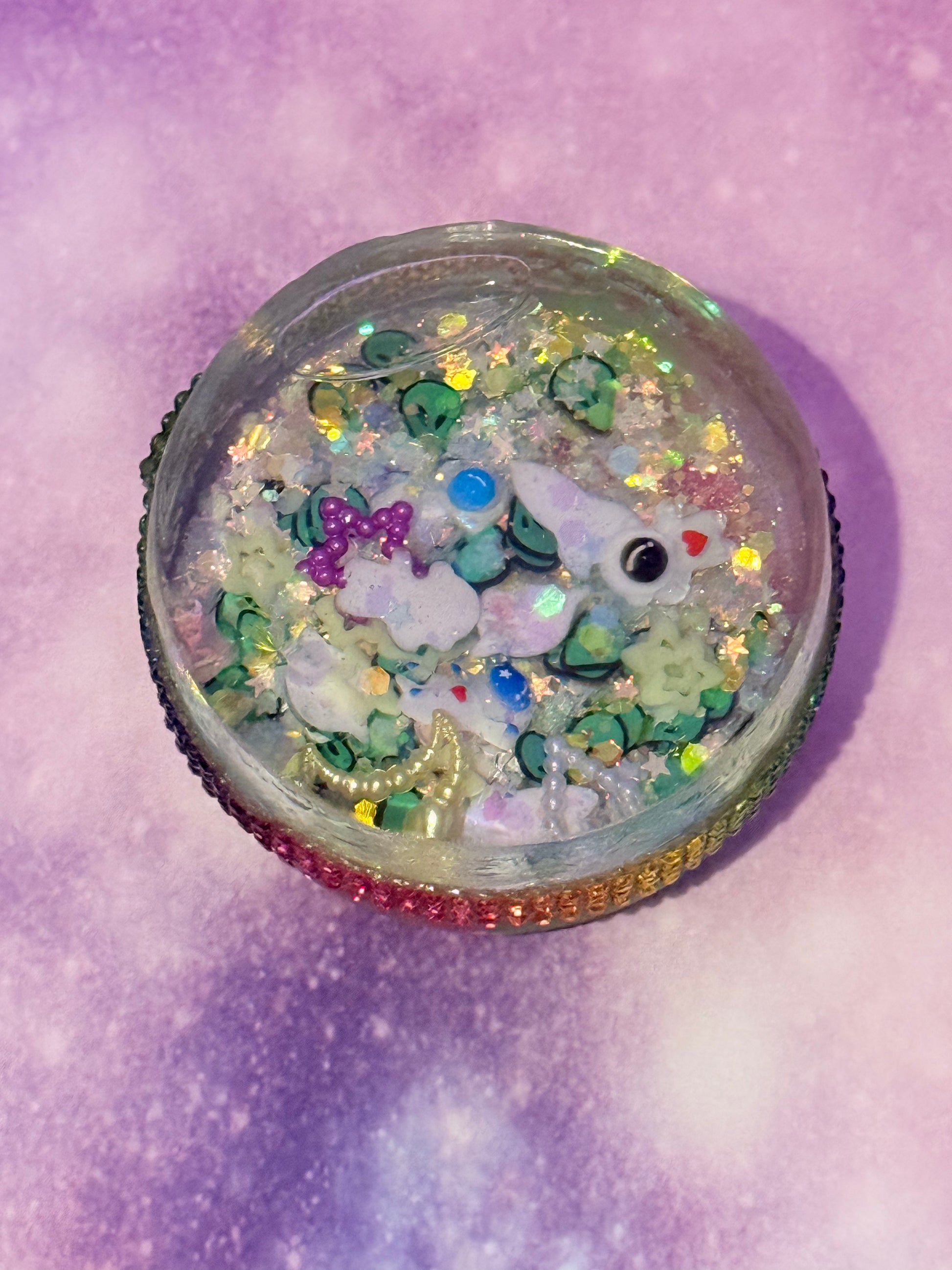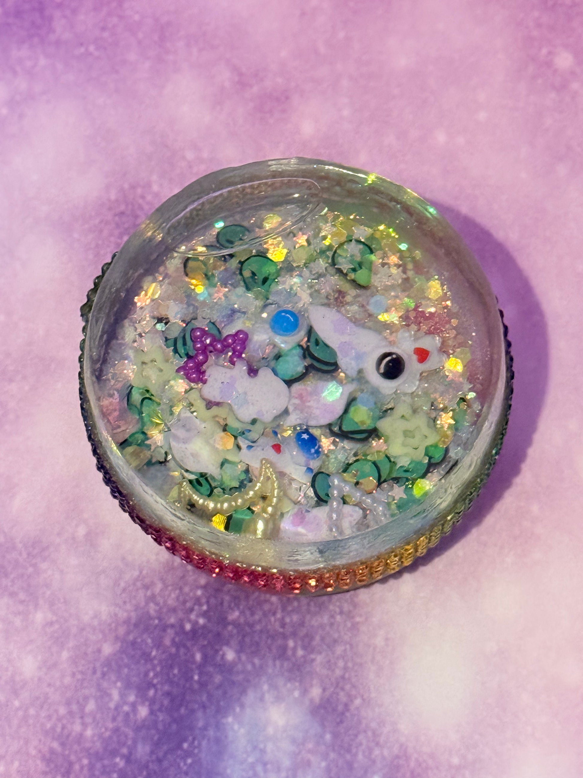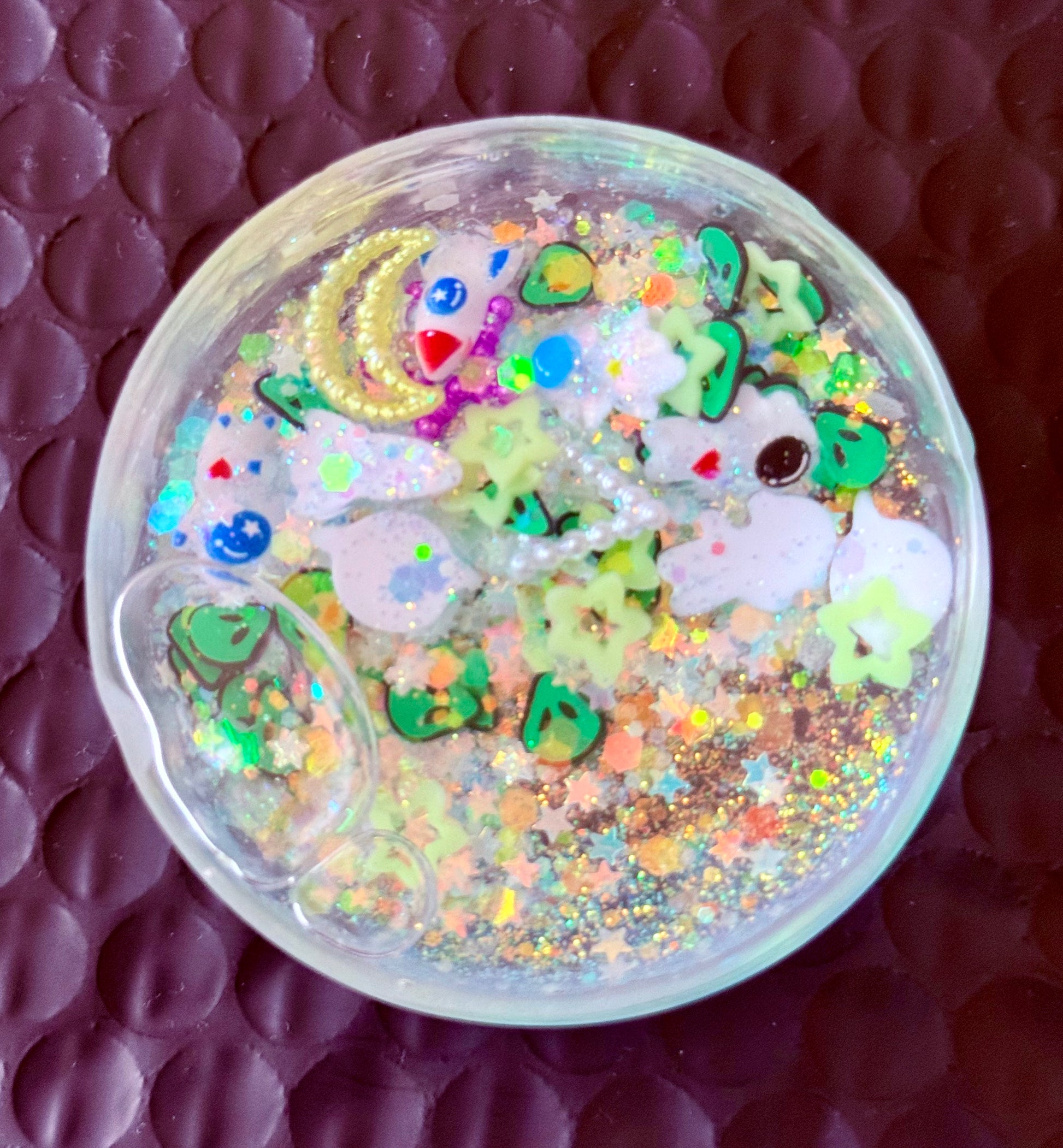 This tool features a gem grip around the edges, making it very satisfying to squeeze. The back of this one features a textured moon and raised galaxy beads. It’s also decorated with neon colours to resemble a nebula.