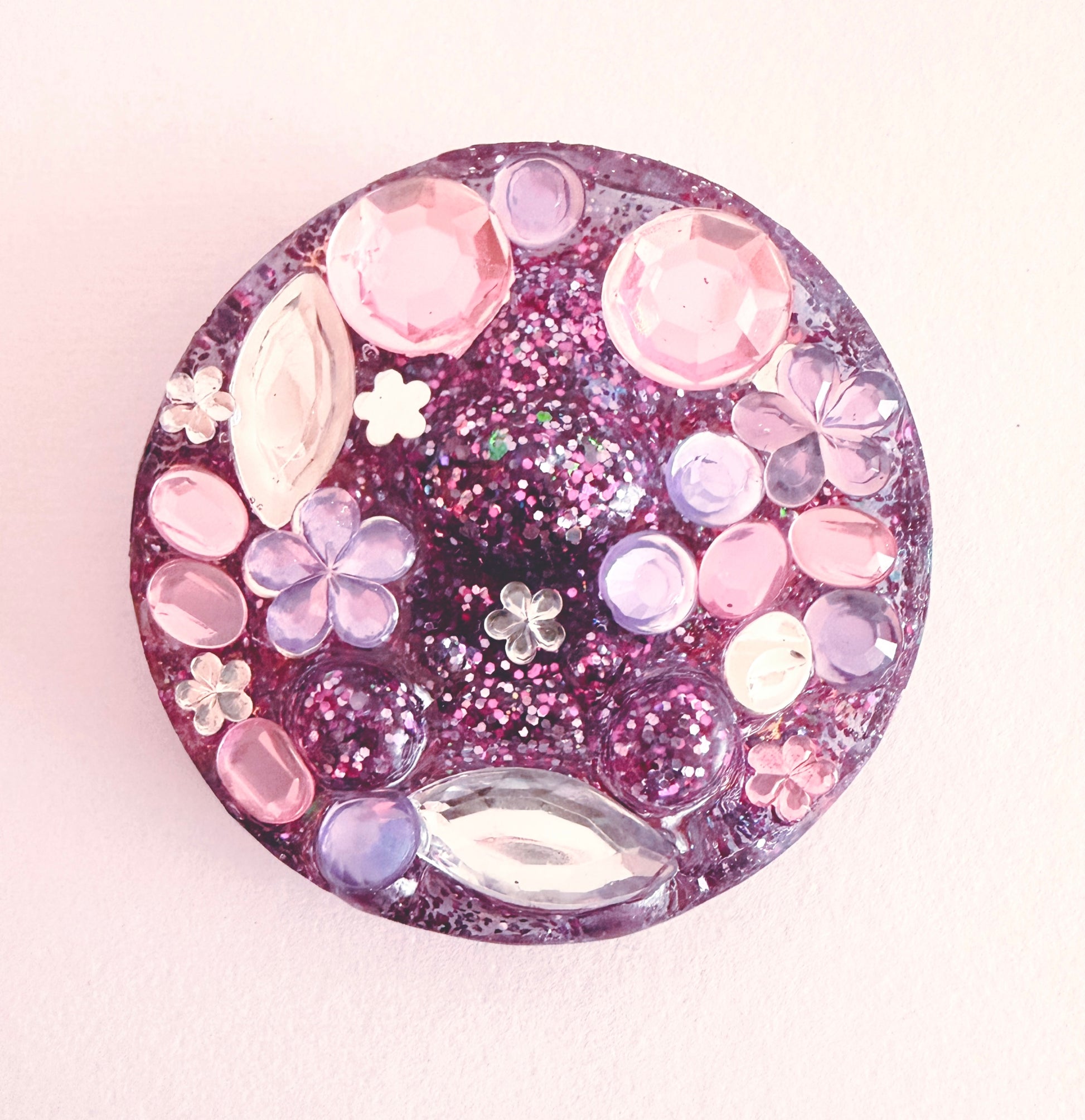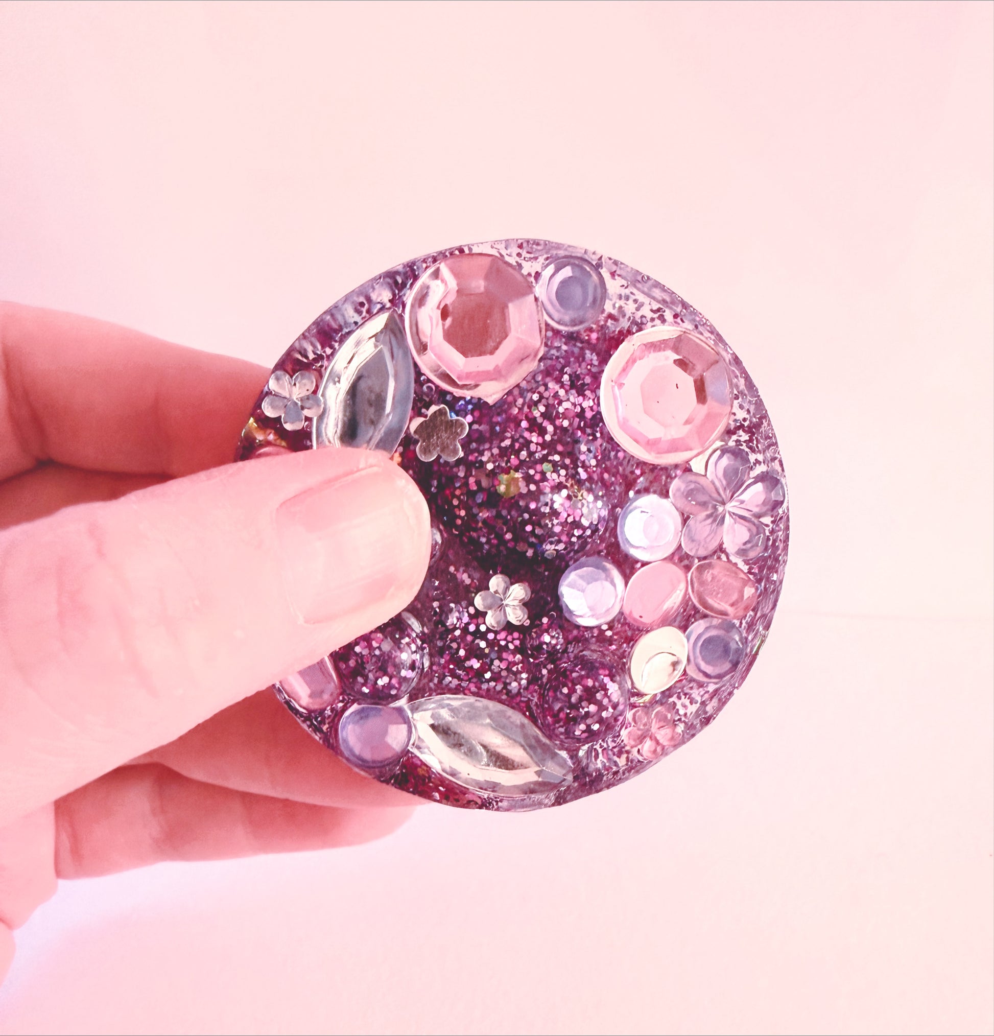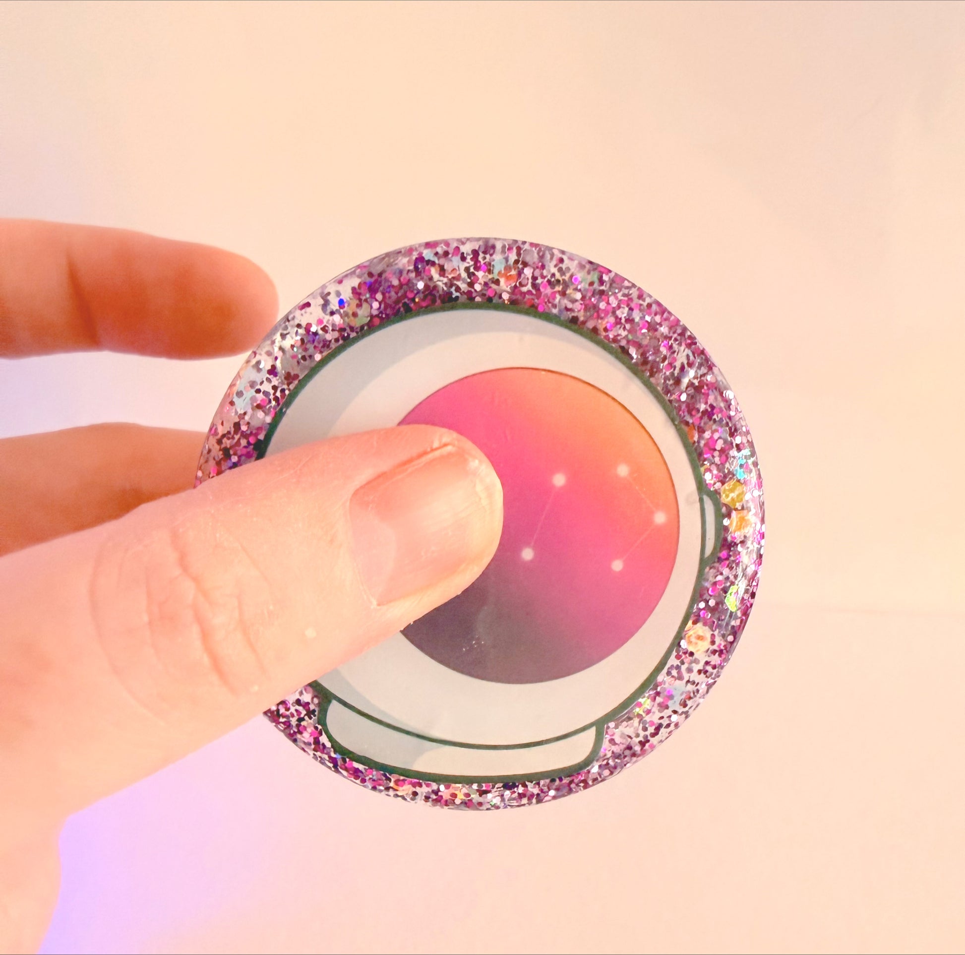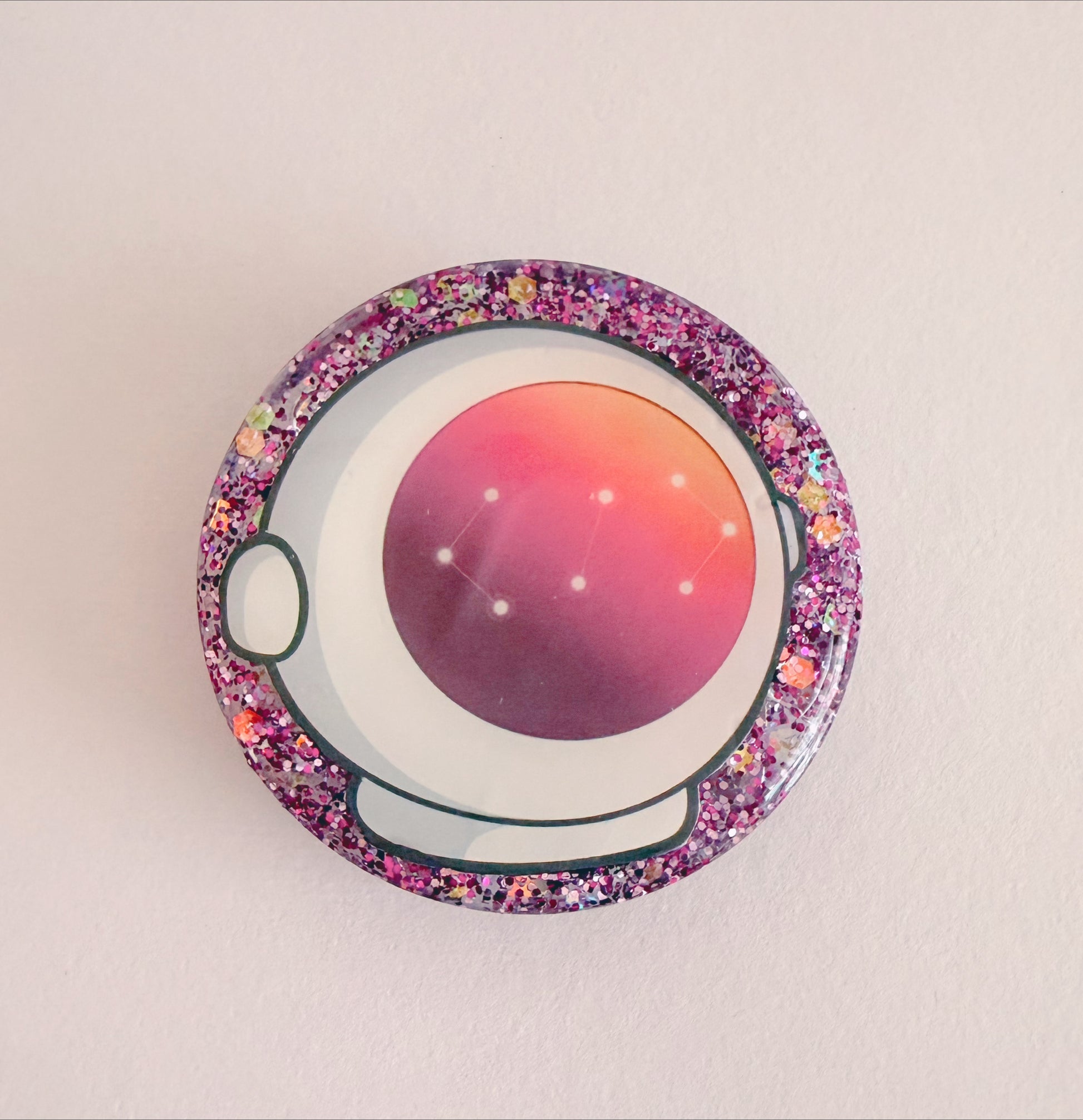 Featuring an astronaut helmet on the front and a worry bear on the back surrounded by raised jewels! Made with glow in the dark glitters. This one is purple and pink and for the girly nerds out there!