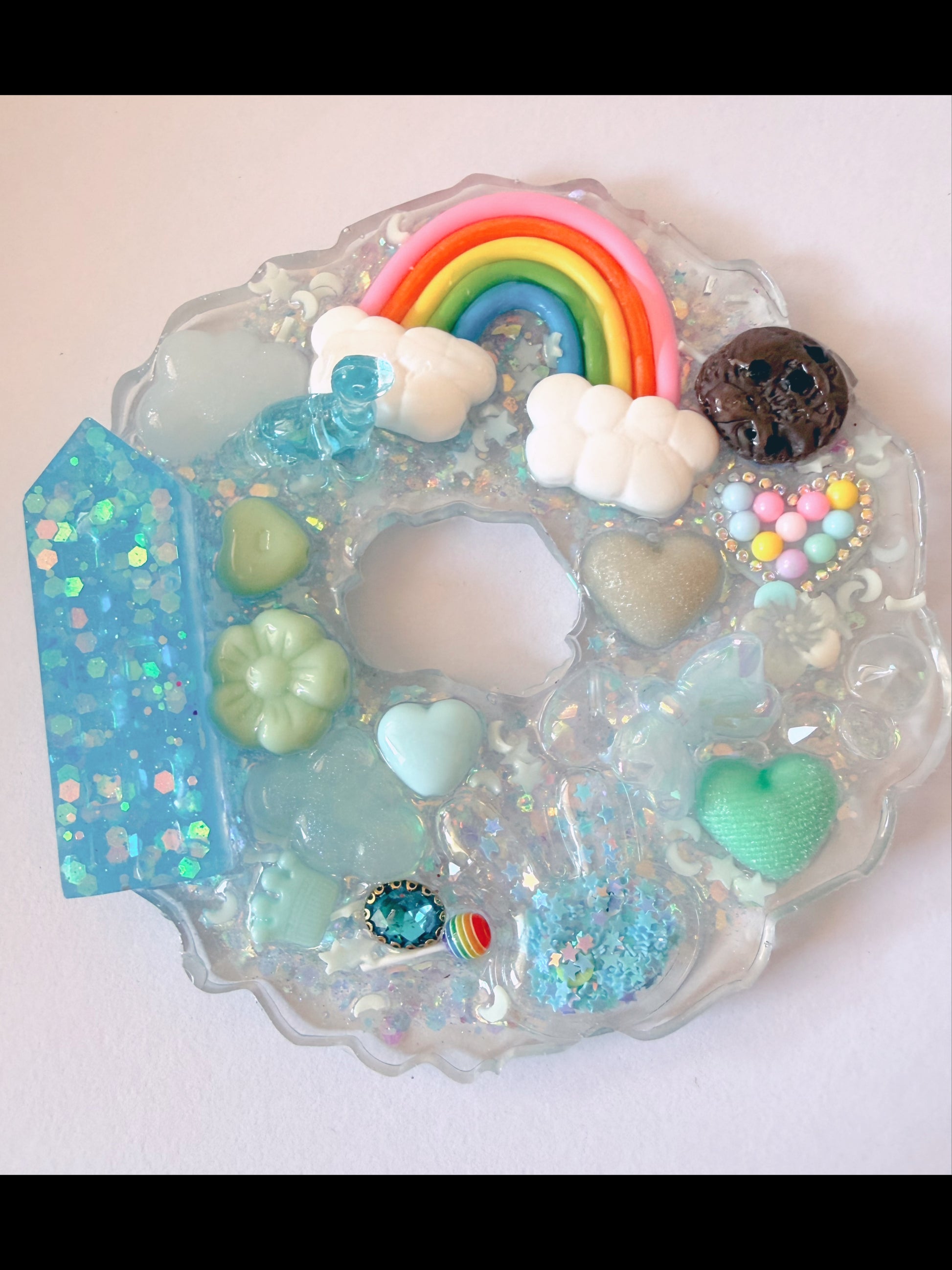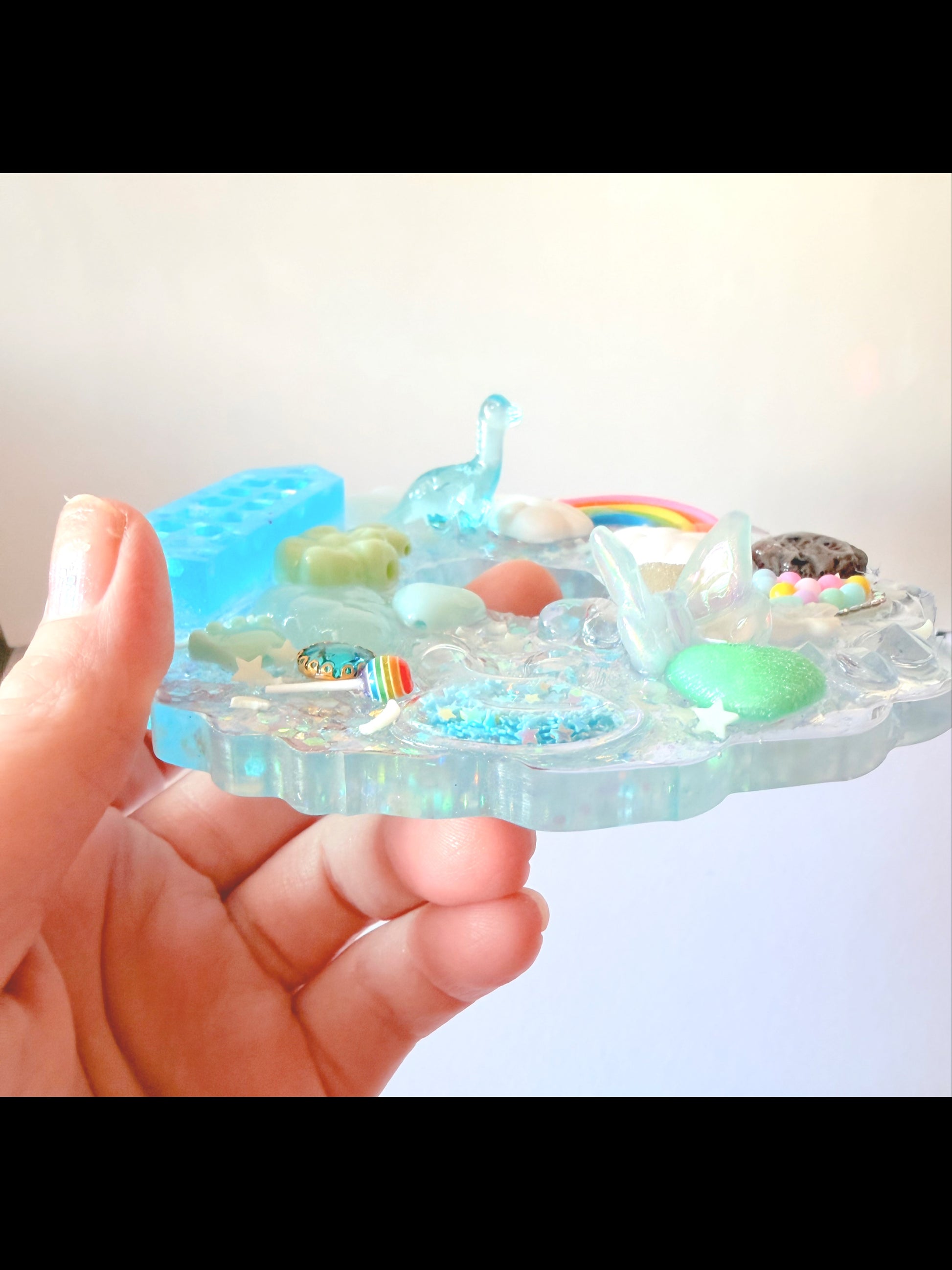 This tool features a very textured cookie, polymer clay rainbow, dinosaur, apartment block that glows very bright, butterflies. Lollipops, gems, clouds and much more. The moons and stars glow too a long with the base!