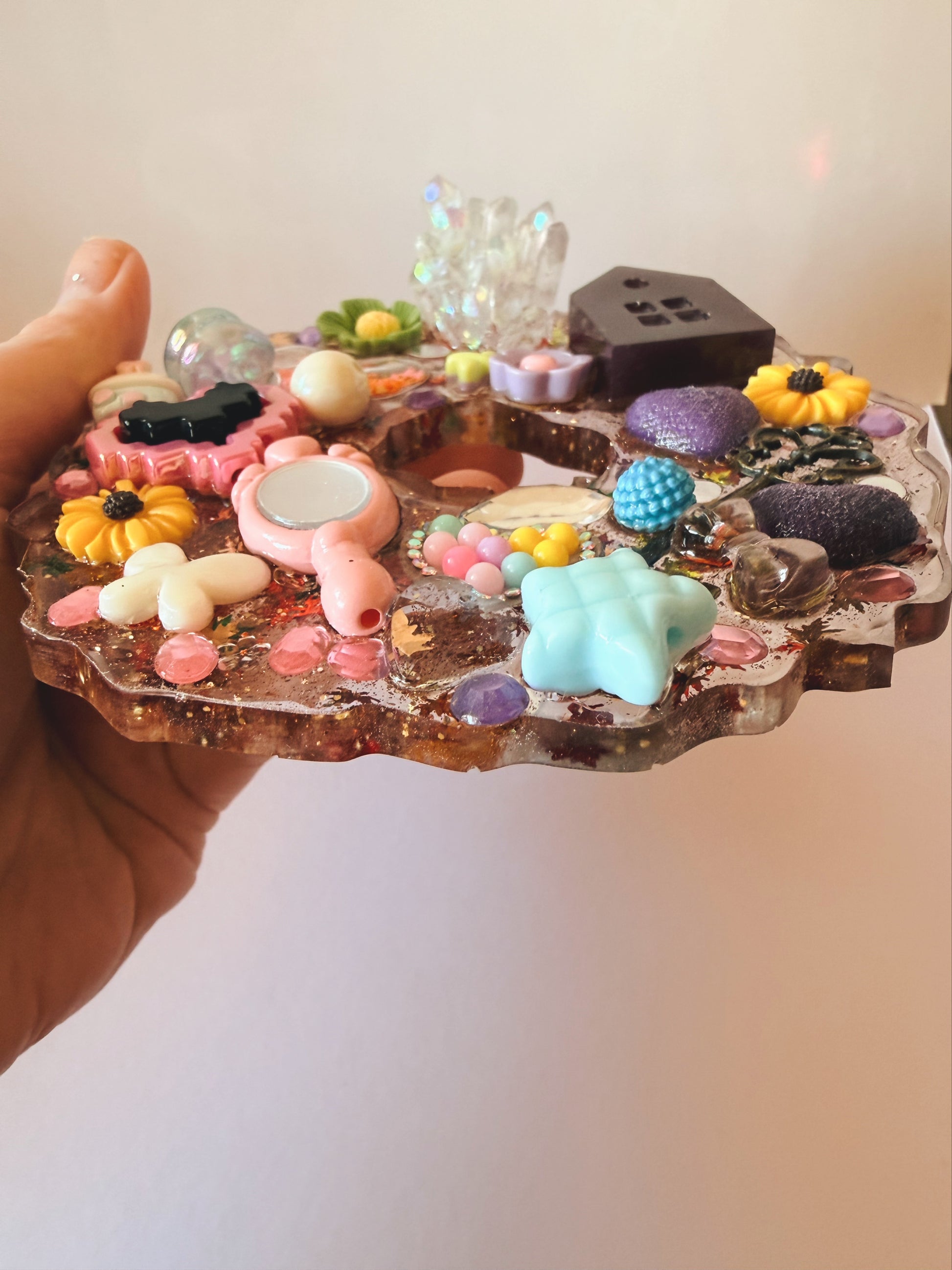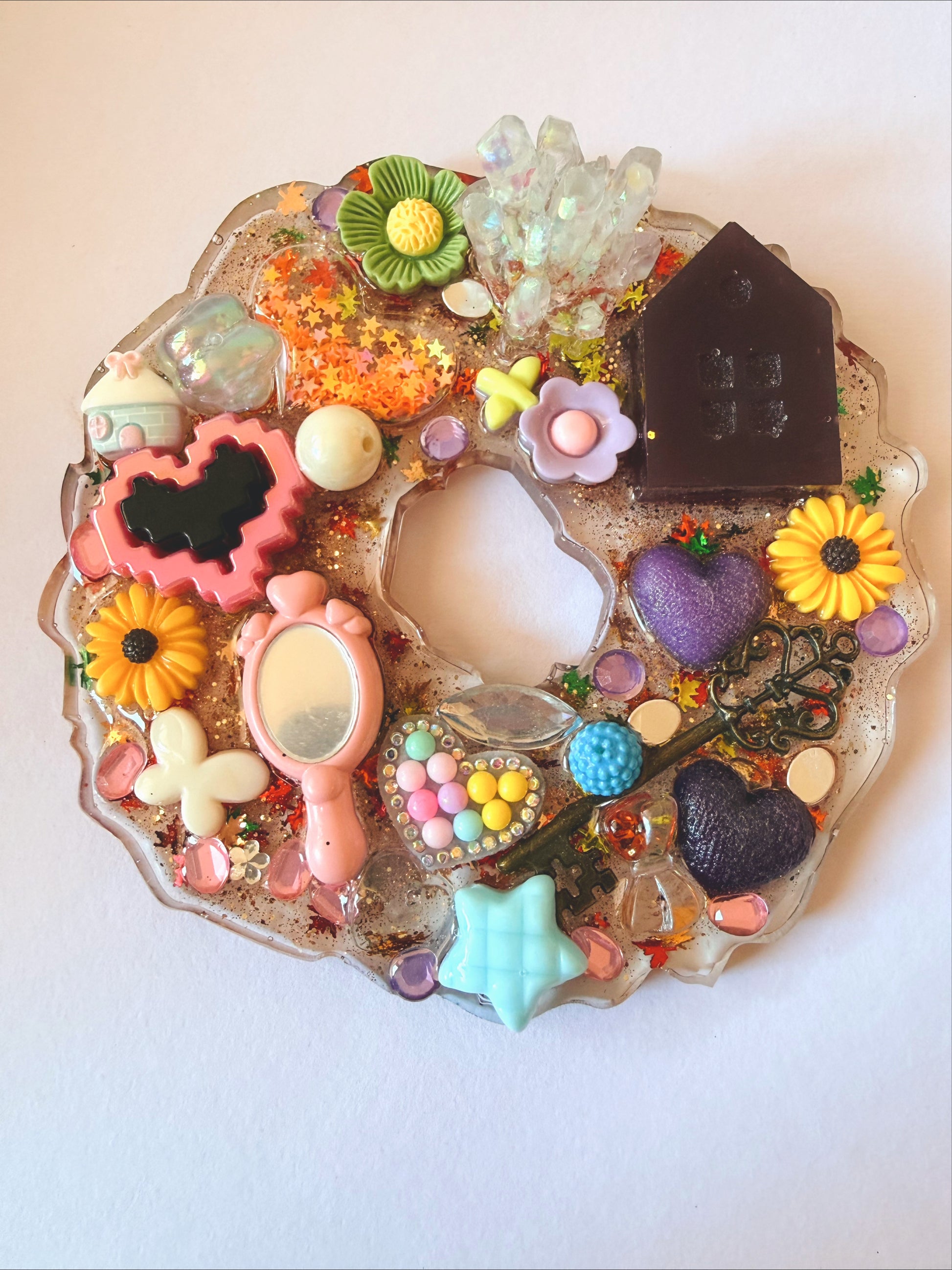 The base is filled with autumn leaves, featuring a colour changing little cottage, clear quartz, a clicky pixel heart, handheld mirror, flowers, keys, chunky beads and more! This one is very textured.