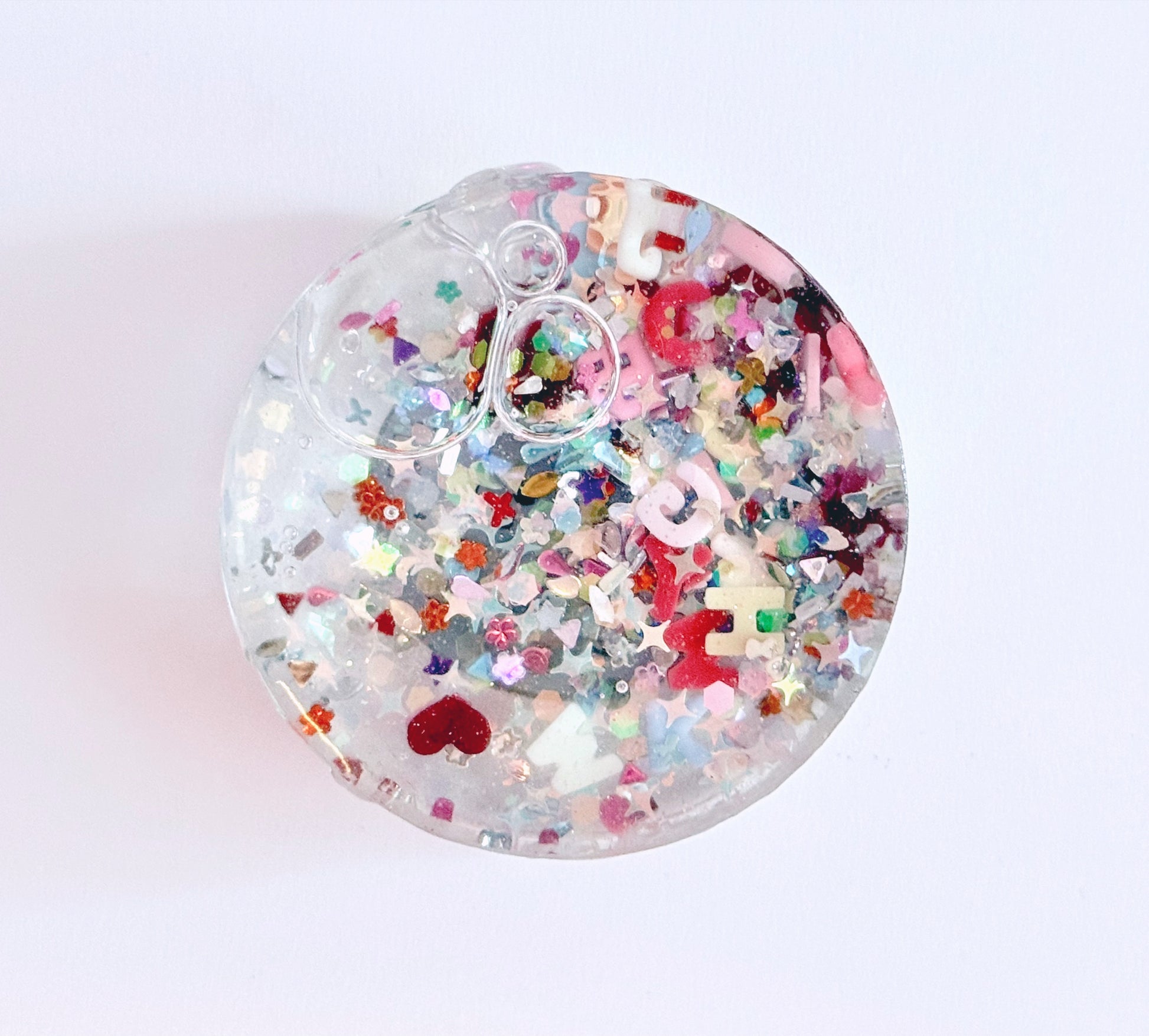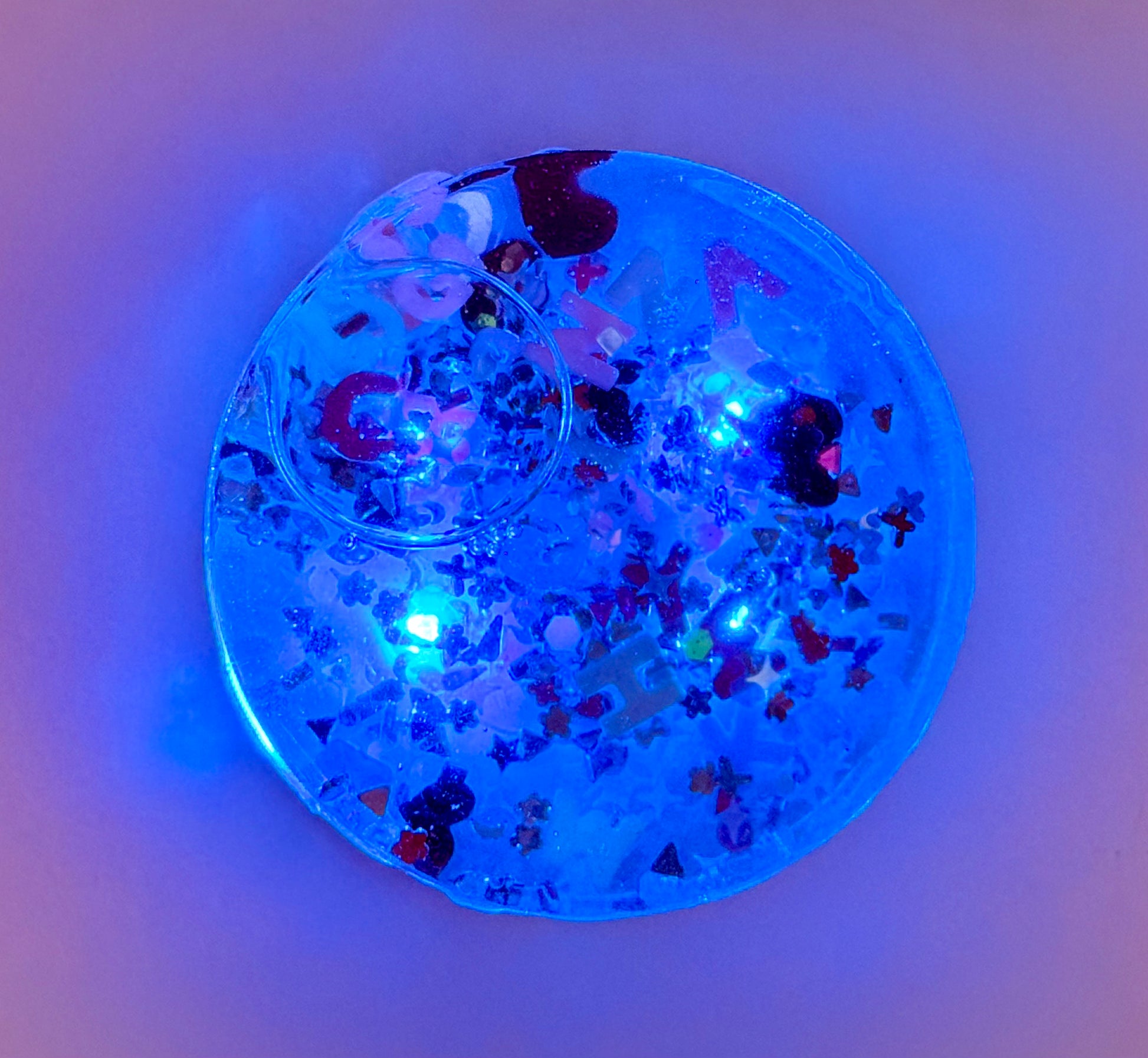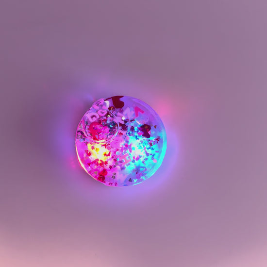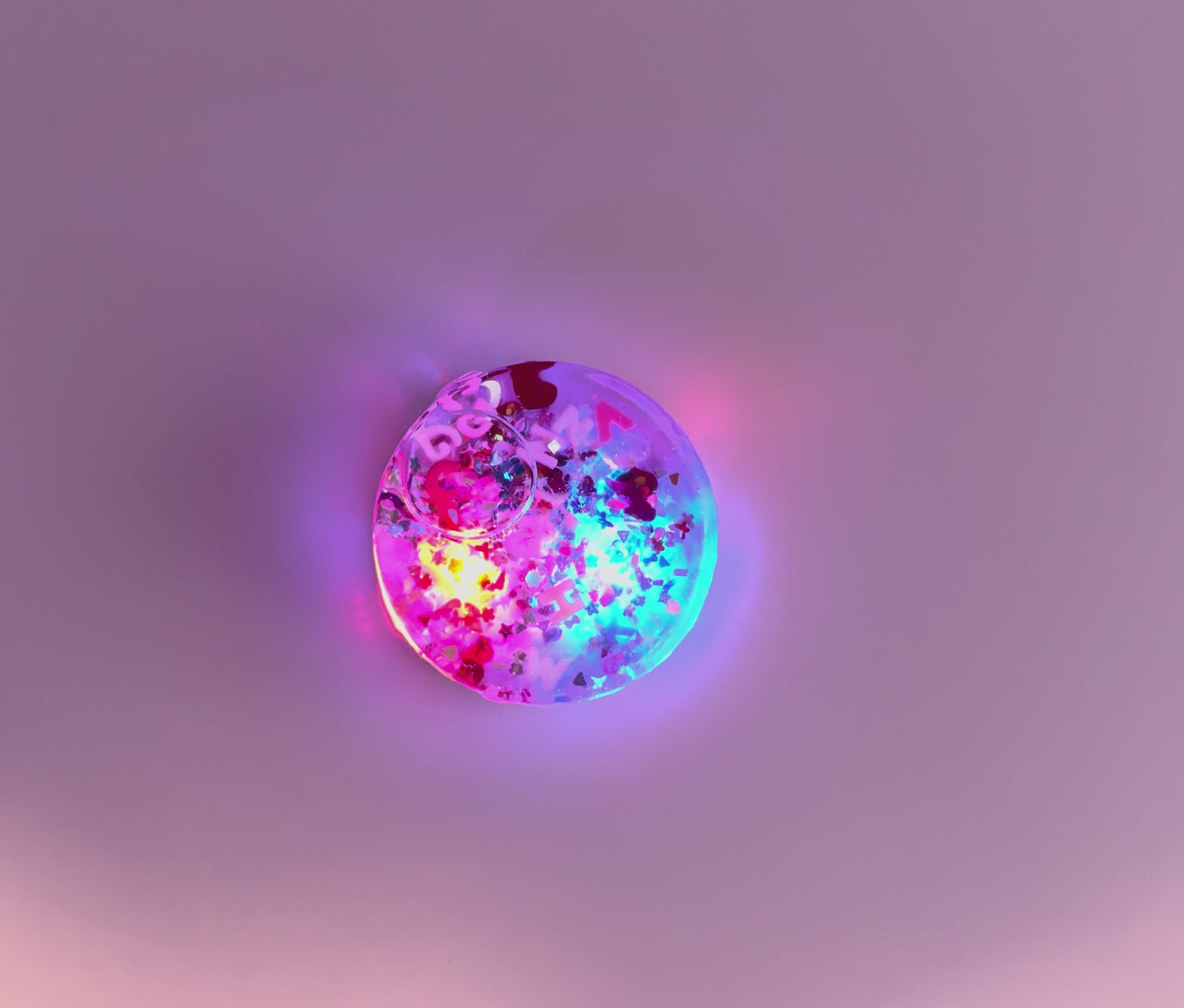 Disco Sue is filled with letters and itâs fun to try and find as many words as you can with the letters inside. Inside are also tiny jewels of many shapes and colours, love heart gems and glow in the dark sparkles. The main feature of this one is that it also flashes many colours when the ON/OFF button on the back is pressed. The button also acts as a fidget in itself because you can feel the click and hear it too!Â