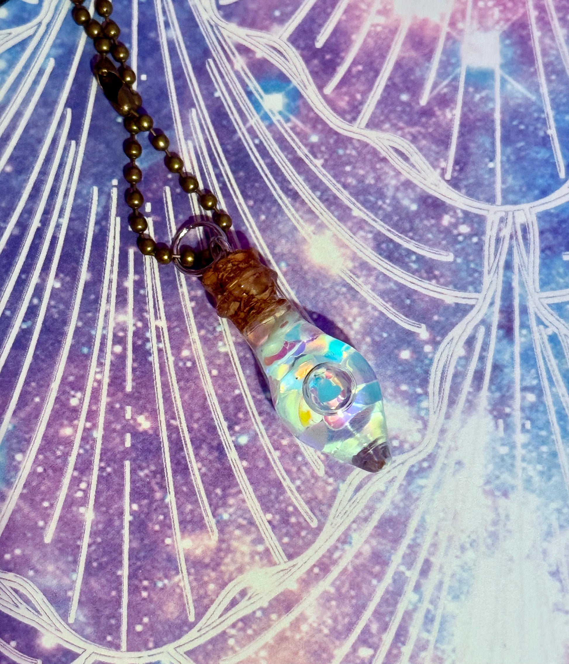 Glow in the dark, opal love hearts floating in a heavy oil so that the hearts flow slowly. Glows very bright when charged with light. Comes on a bronze chain.