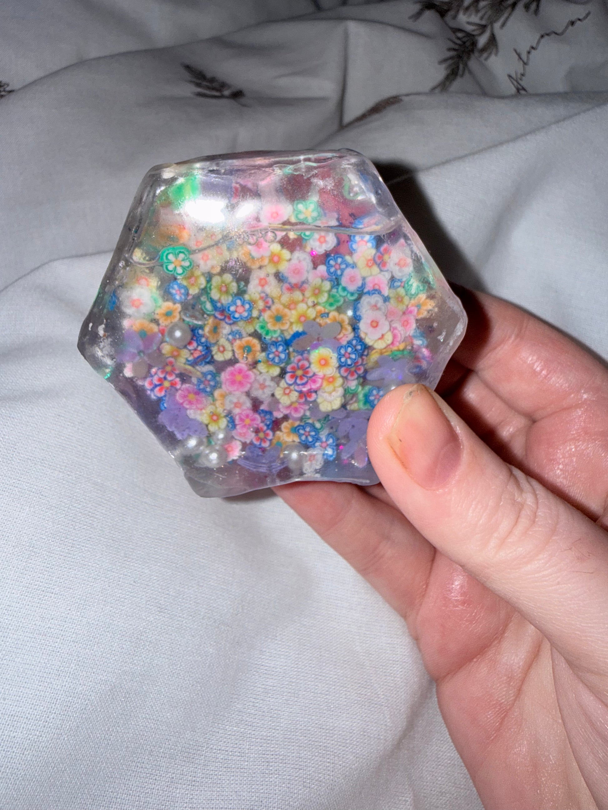 I made this piece after making several autumn leaves shakers and decided I wanted to see some vibrant colours reminiscent of springtime. The hexagon shape is slightly larger than the usual star designs and fits perfectly in the palm of your hand. Filled with an abundance of tiny, polymer clay flowers and tiny pearls, I also added a few shimmery lavender flowers for a little glisten when it hits sunlight. Vibrant and beautiful, this mesmerising little sensory tool will keep your eyes occupied when you need it most. Named “The Floating Flower Garden” by Louisa on TikTok who has purchased a couple of my floating tools and loves them!