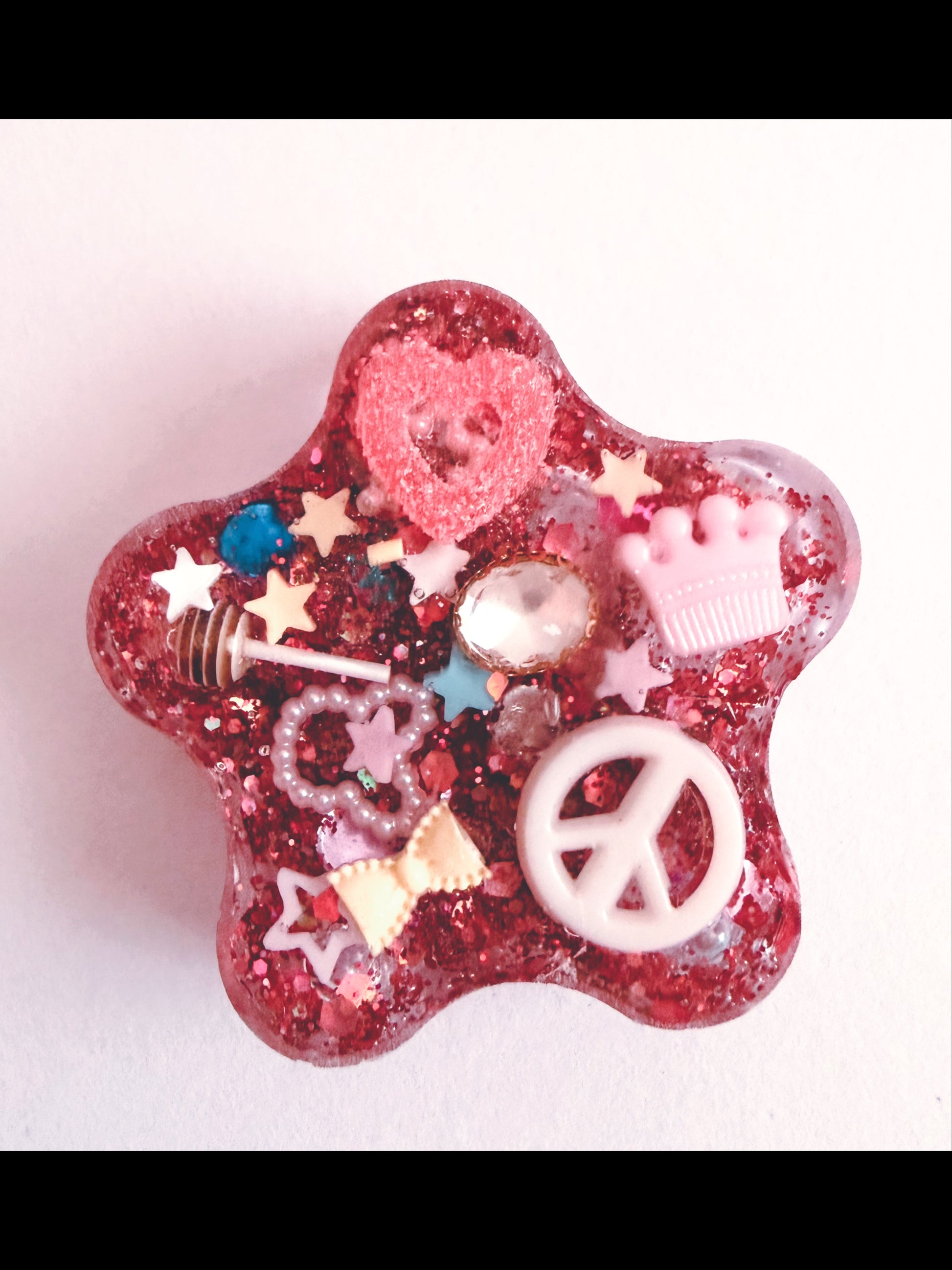 The back of this tool as you can see in the photos is very generously packed with a selection of various charms and each one having its own texture and feel. From sugary sweets for a medium pain stim, to raised bumpy beads that feel smooth and satisfying when pressed. This tool is great for grounding, refocusing, meditation and fidgeting.