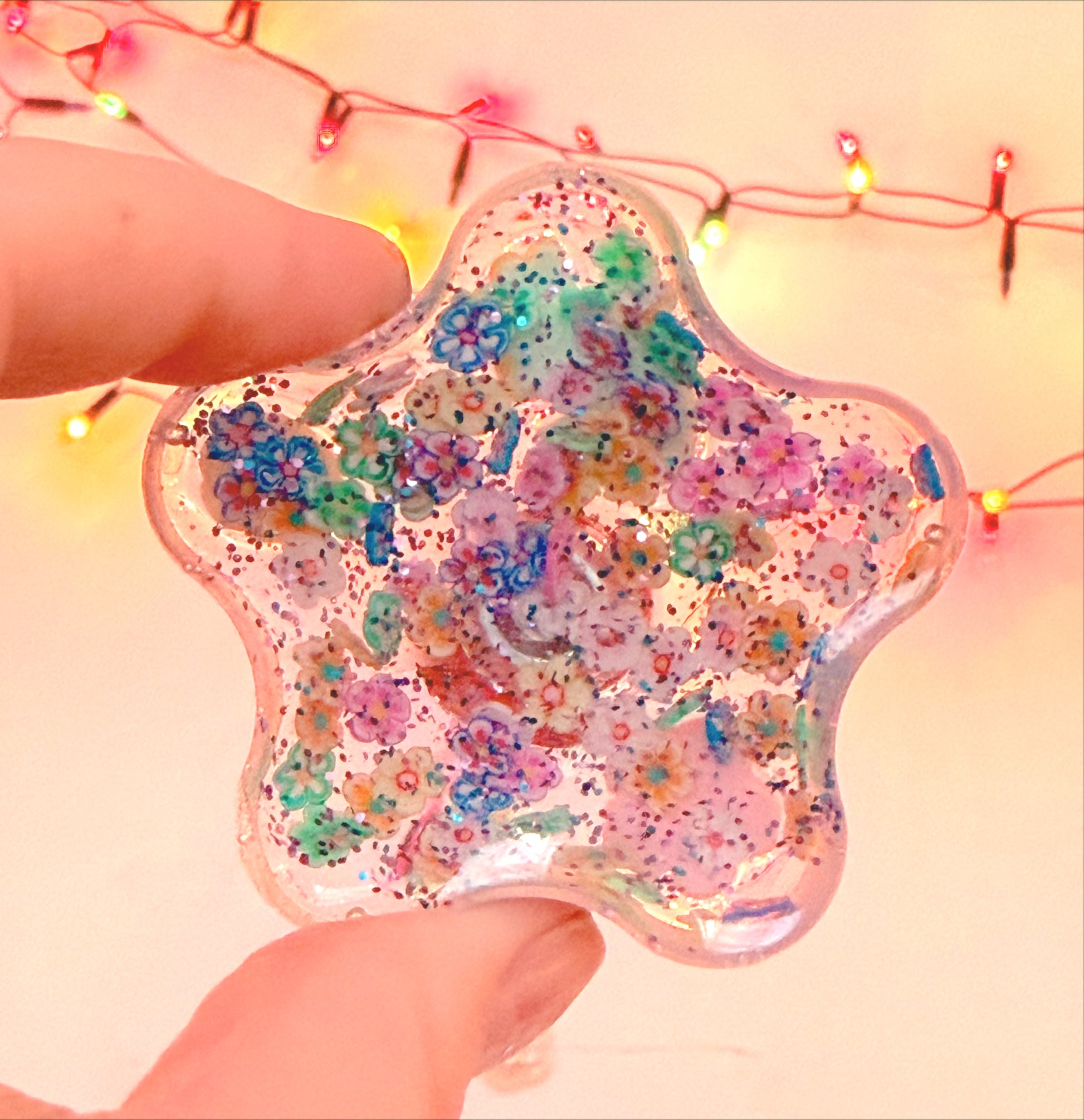 * The tool is filled with tiny polymer clay flowers and glitter, glistening in the light. The raised, bumpy flowers are ideal for running your fingers across. 🌸