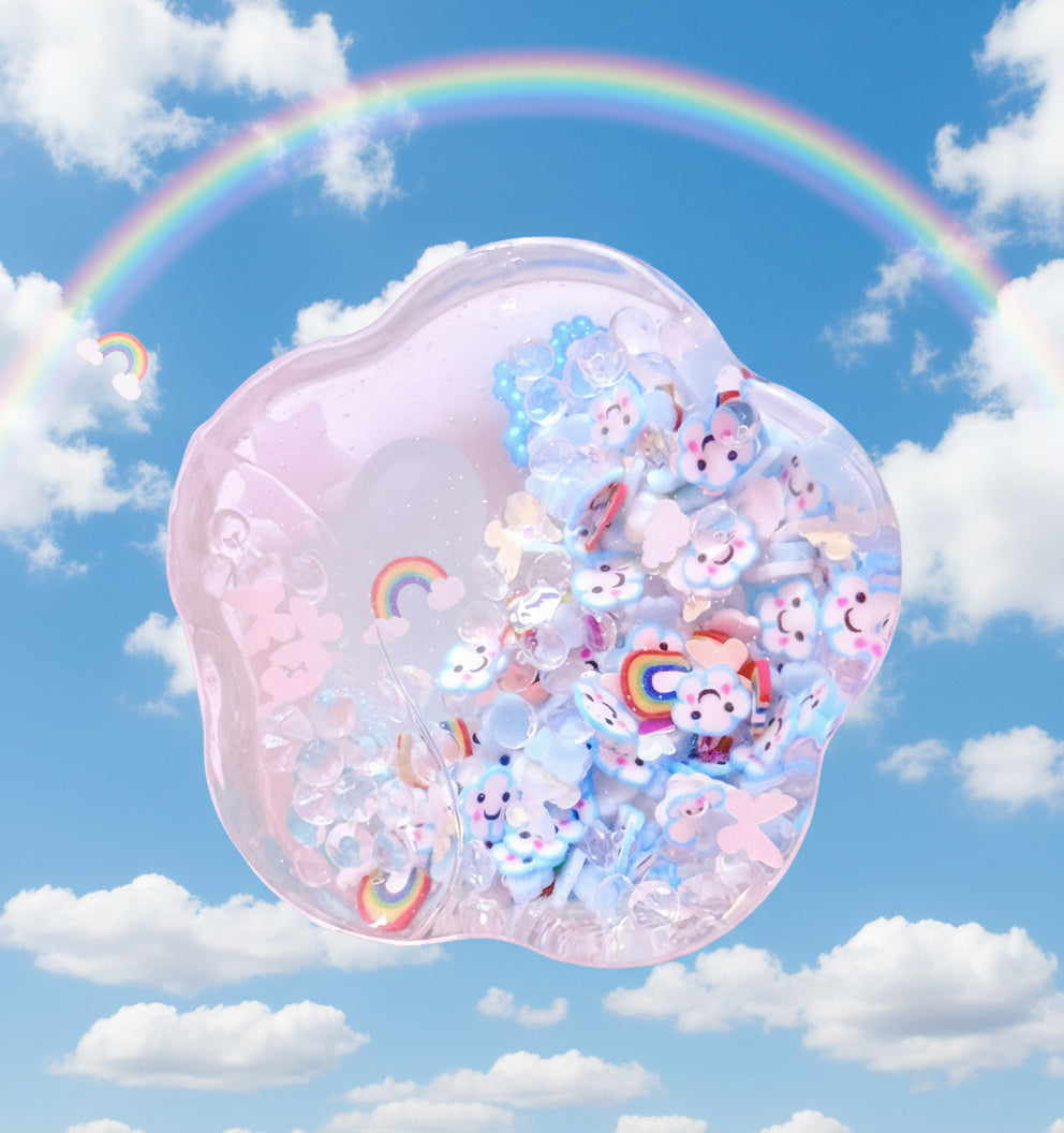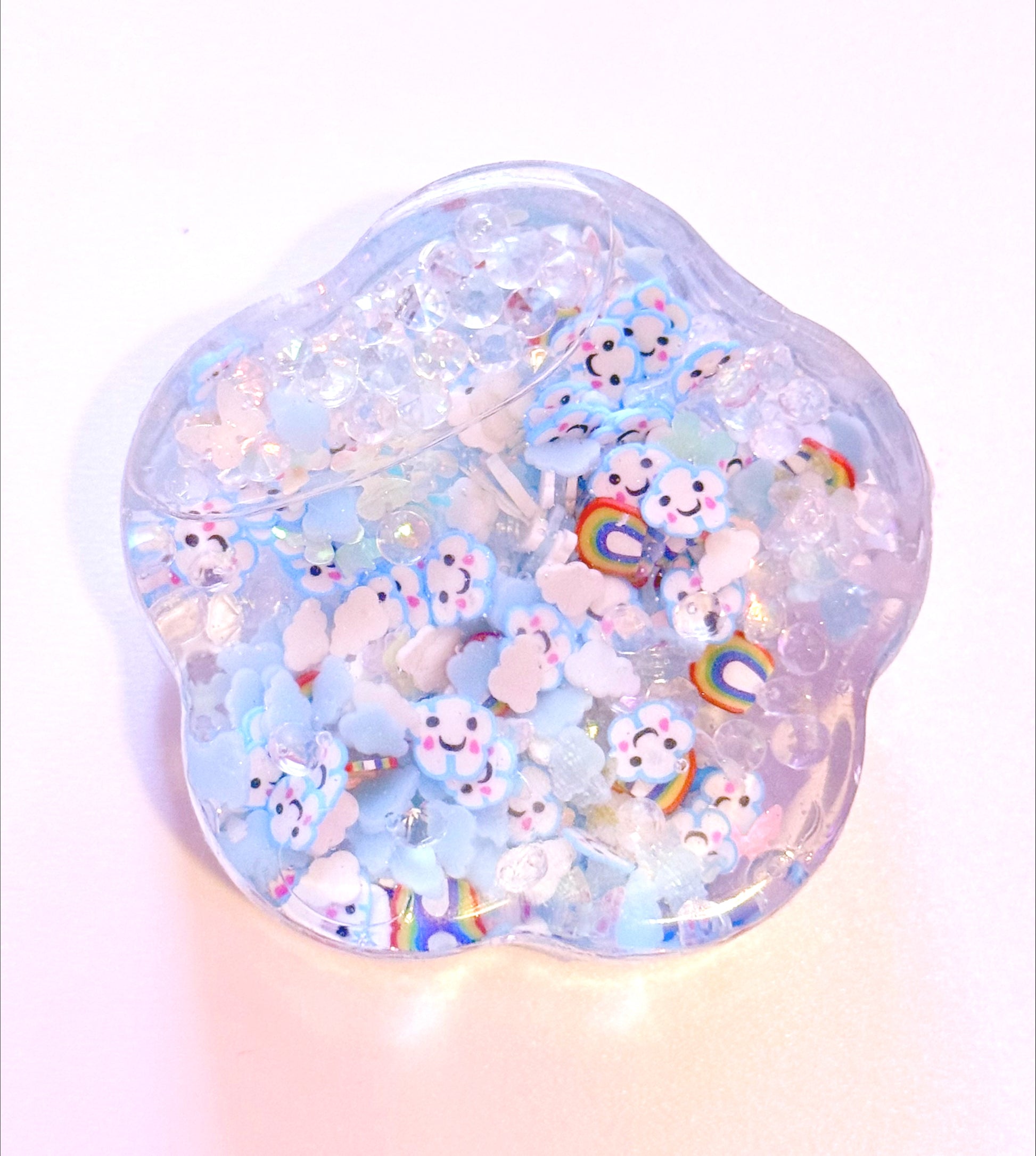 Inside this flower shaped liquid fidget are tiny blue and white clouds, smiley blue clouds, rainbows, crystals and glow in the dark butterflies. It looks like a summers day after a soft rainfall. At nighttime, it looks like butterflies have lit the sky in their warm, green fluorescence.
