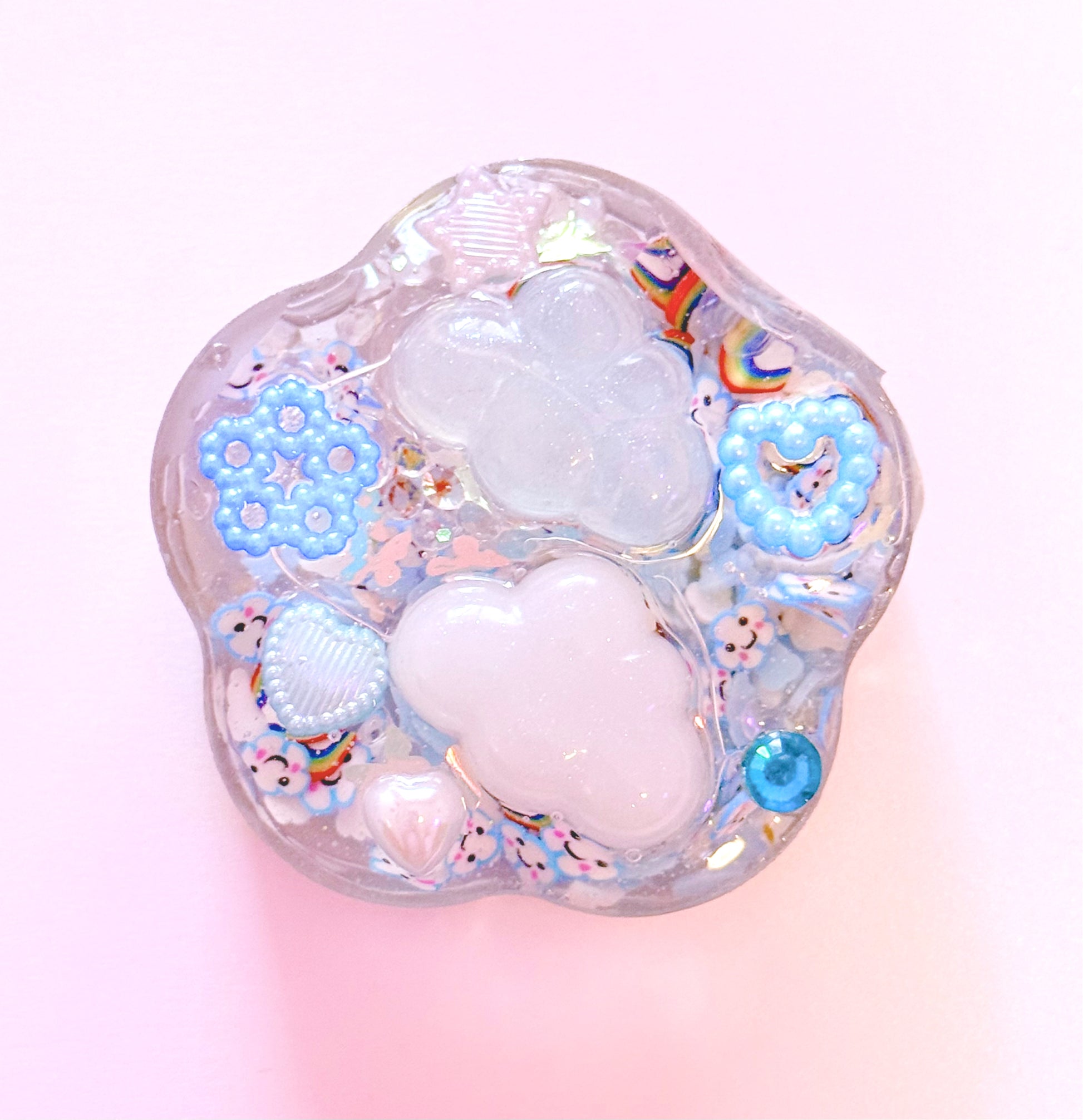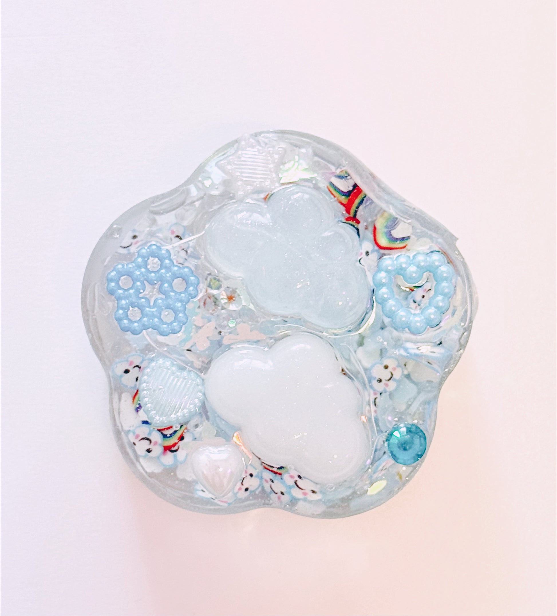 On the back are raised cloud charms that are very shimmery and soft to touch. There are also raised beads of various textures, shapes and colours. Making this one a pleasure to rub your fingertips across.