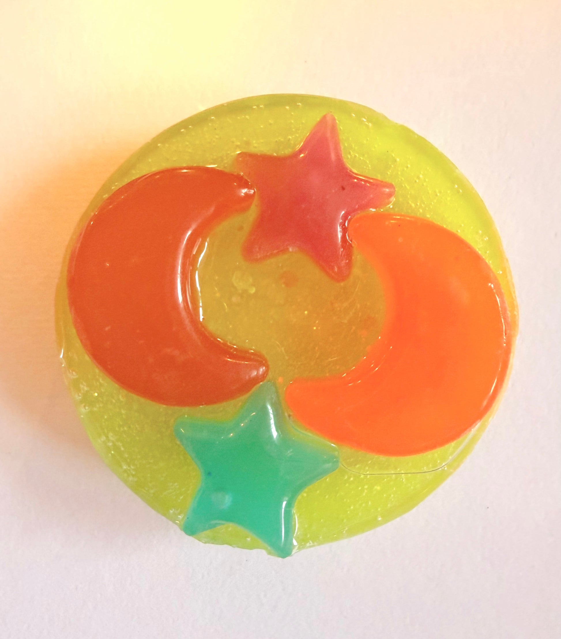 This one features a dark photo of a hooded character with the sun looking out of the hood rather than the usual darkness. This piece is also very glow in the dark and UV light sensitive. On the back are moons and stars that also glow, they’re very chunky and make for a satisfying handheld sensory tool to take anywhere.
