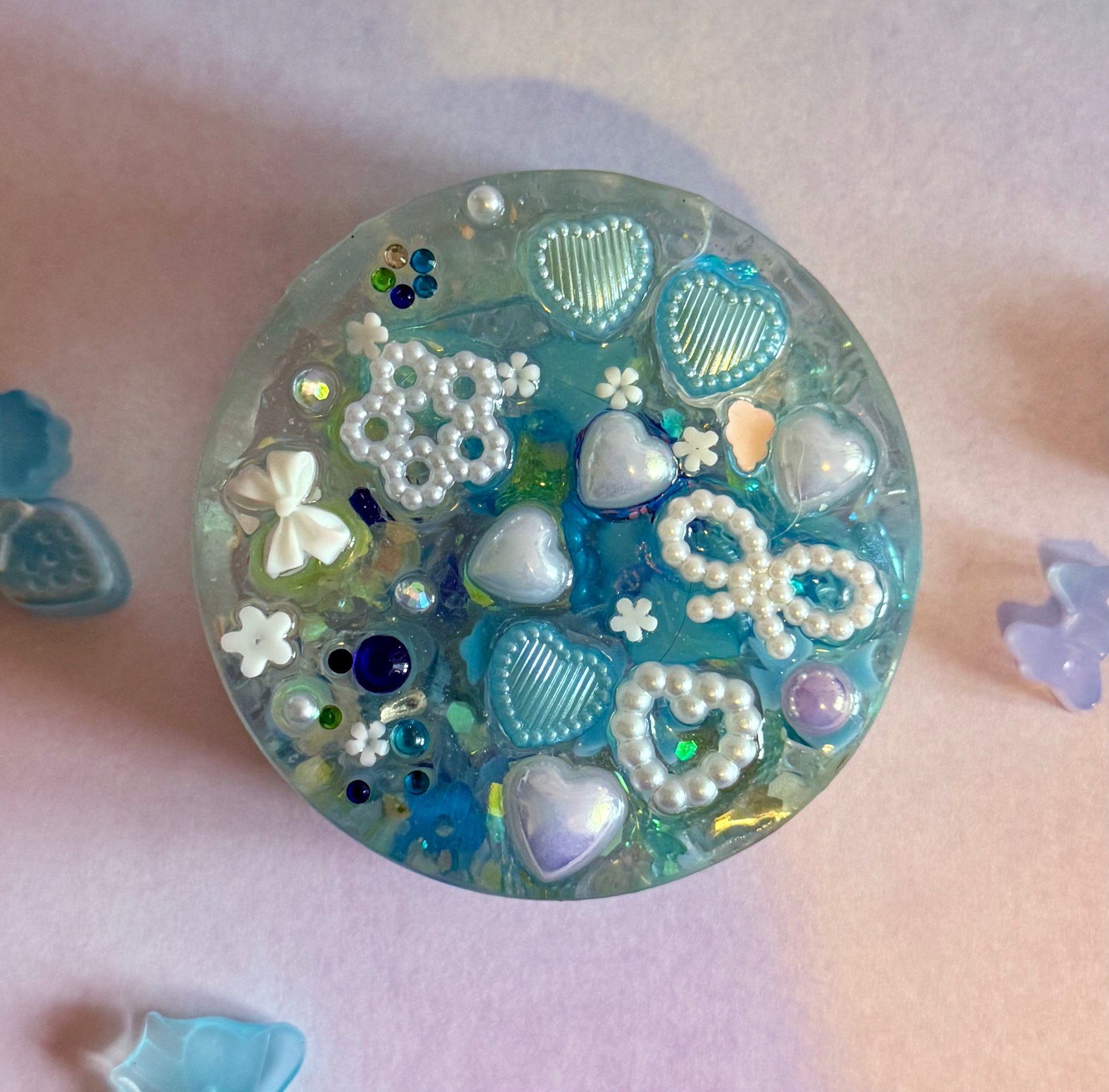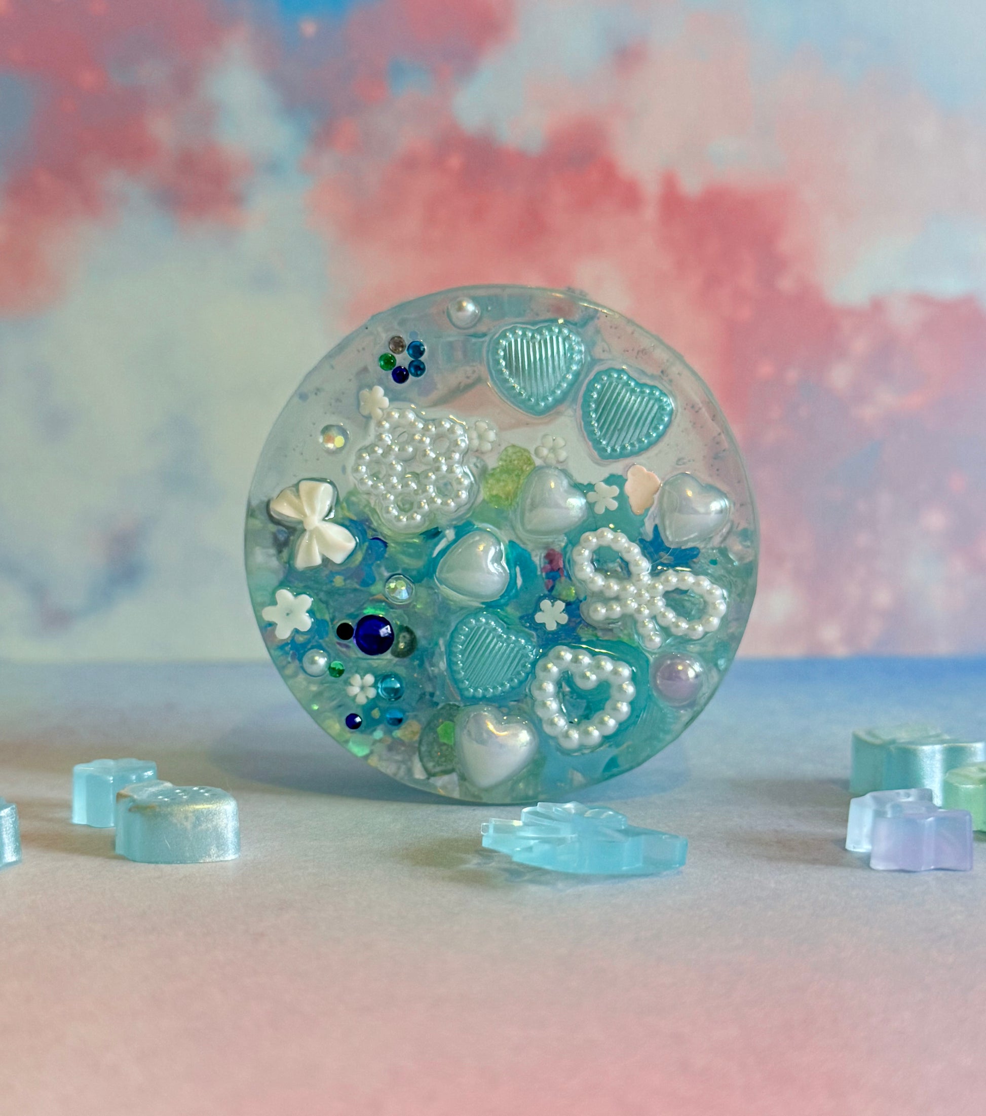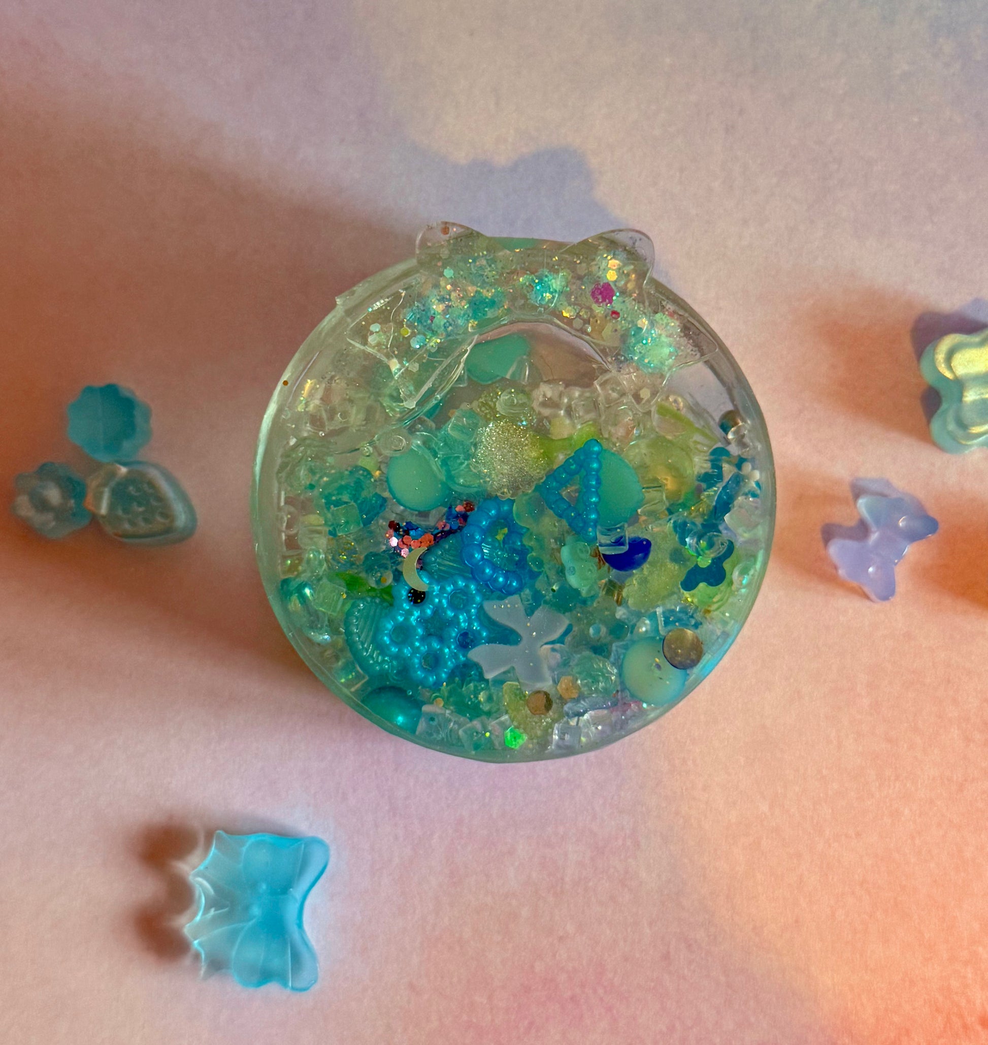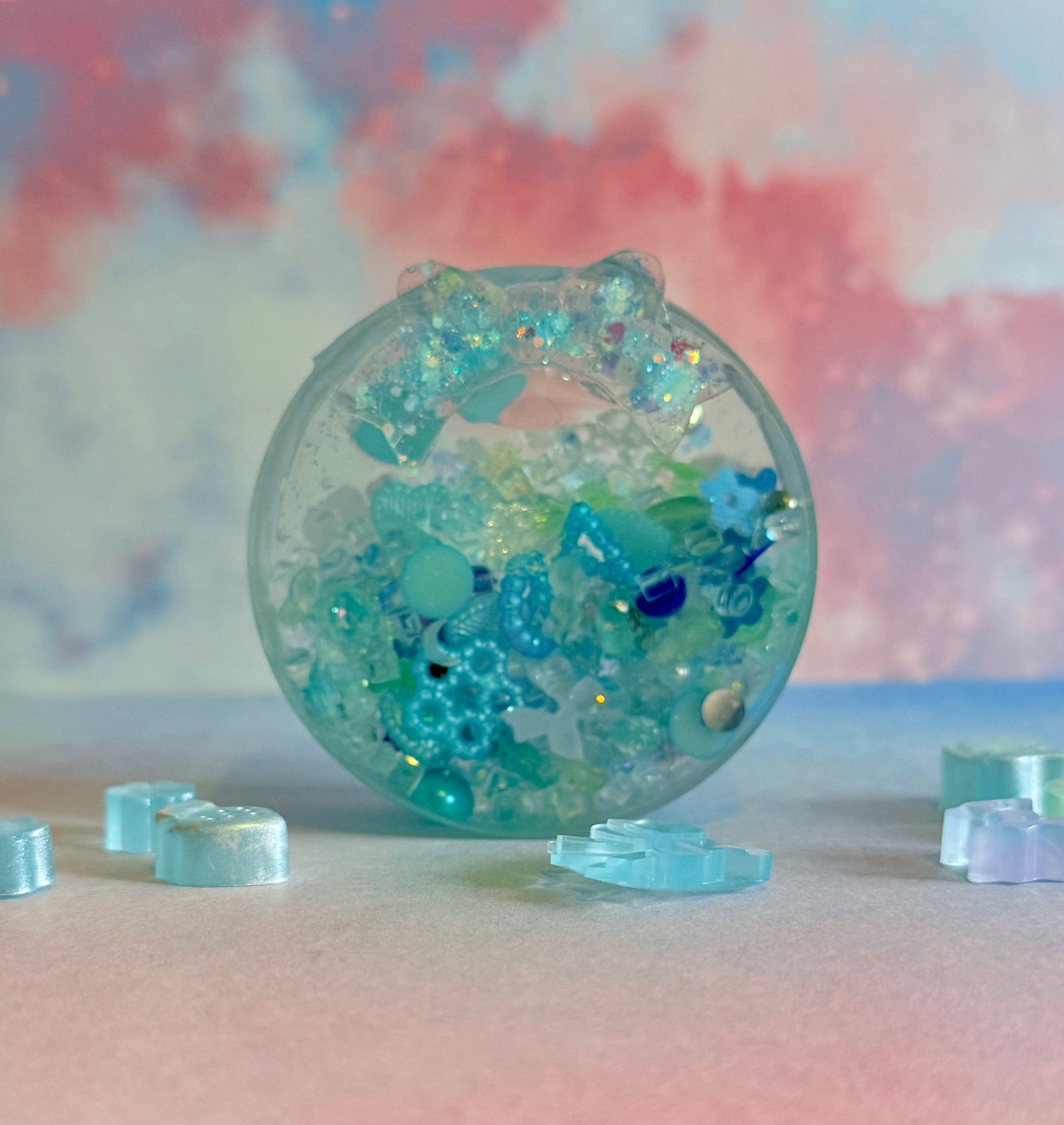 A distilled water filled stone featuring charms of various shapes and sizes. What can you find?! Smooth surface and textured back decorated with various charms. Sounds like gentle raindrops falling on the roof of a tent!