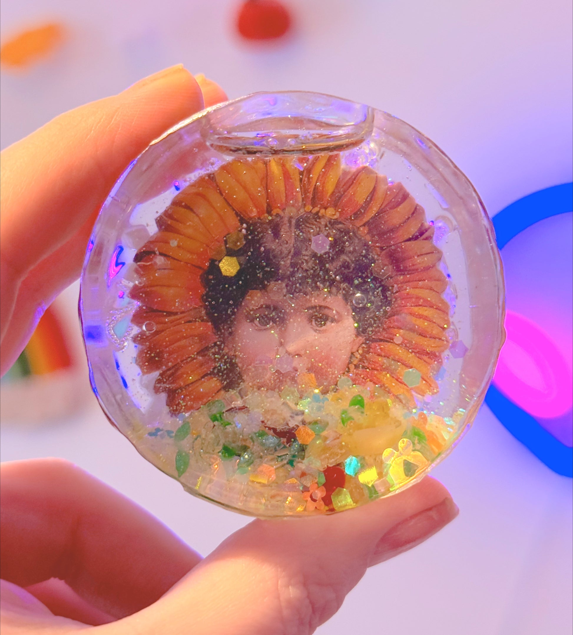 This piece was inspired by the golden hour in the summertime. Think of glistening, holographic Sun rays in your peripheral as you sit on a beach on a summers evening. The back is textured with endless tiny charms including a cherub, sunflowers and ribbons.
