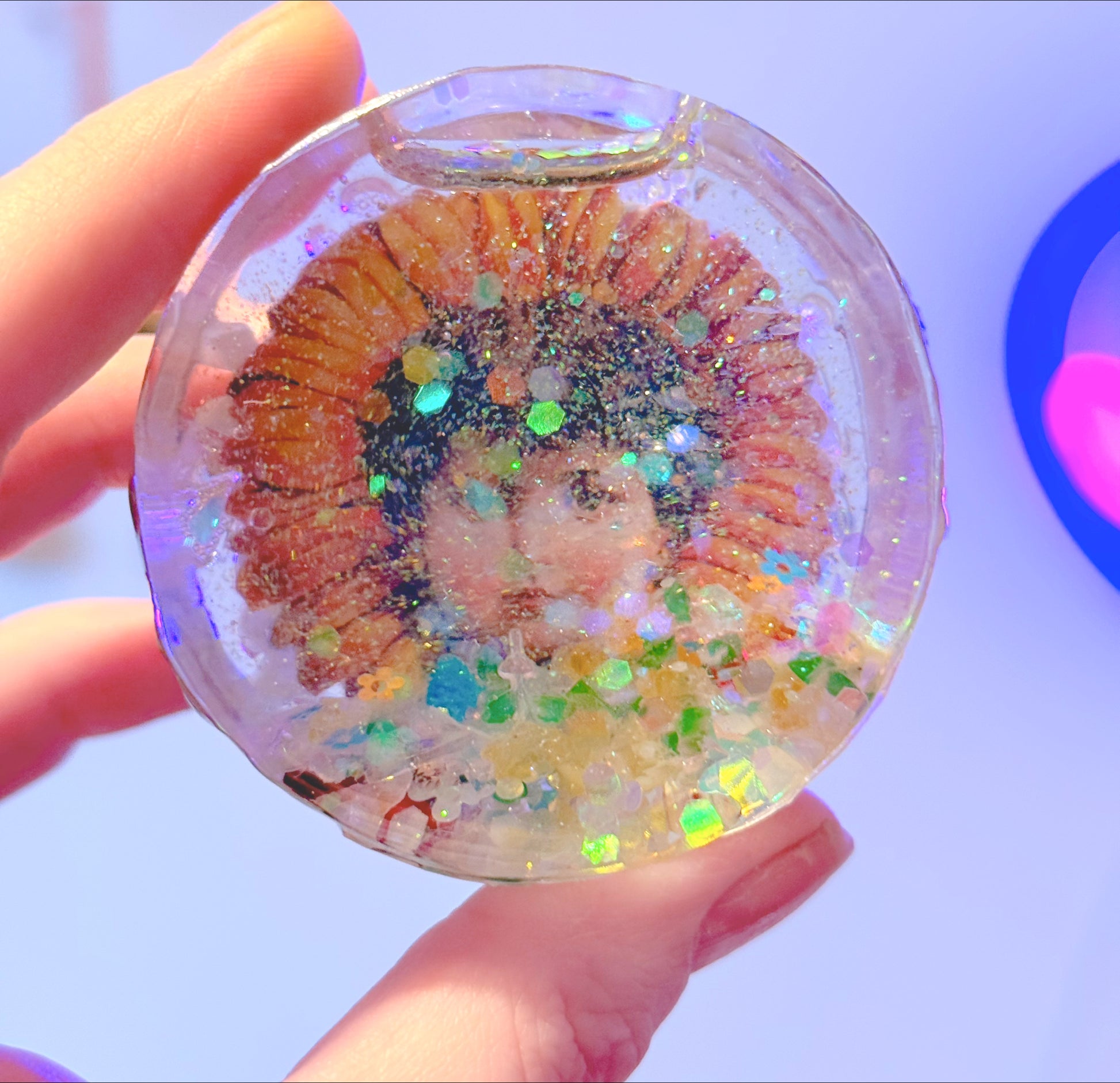 This tool features a lady in front of a sunflower inside the tool who stands frozen in time as glow in the dark glitter and various yellow charms fall gently around her.