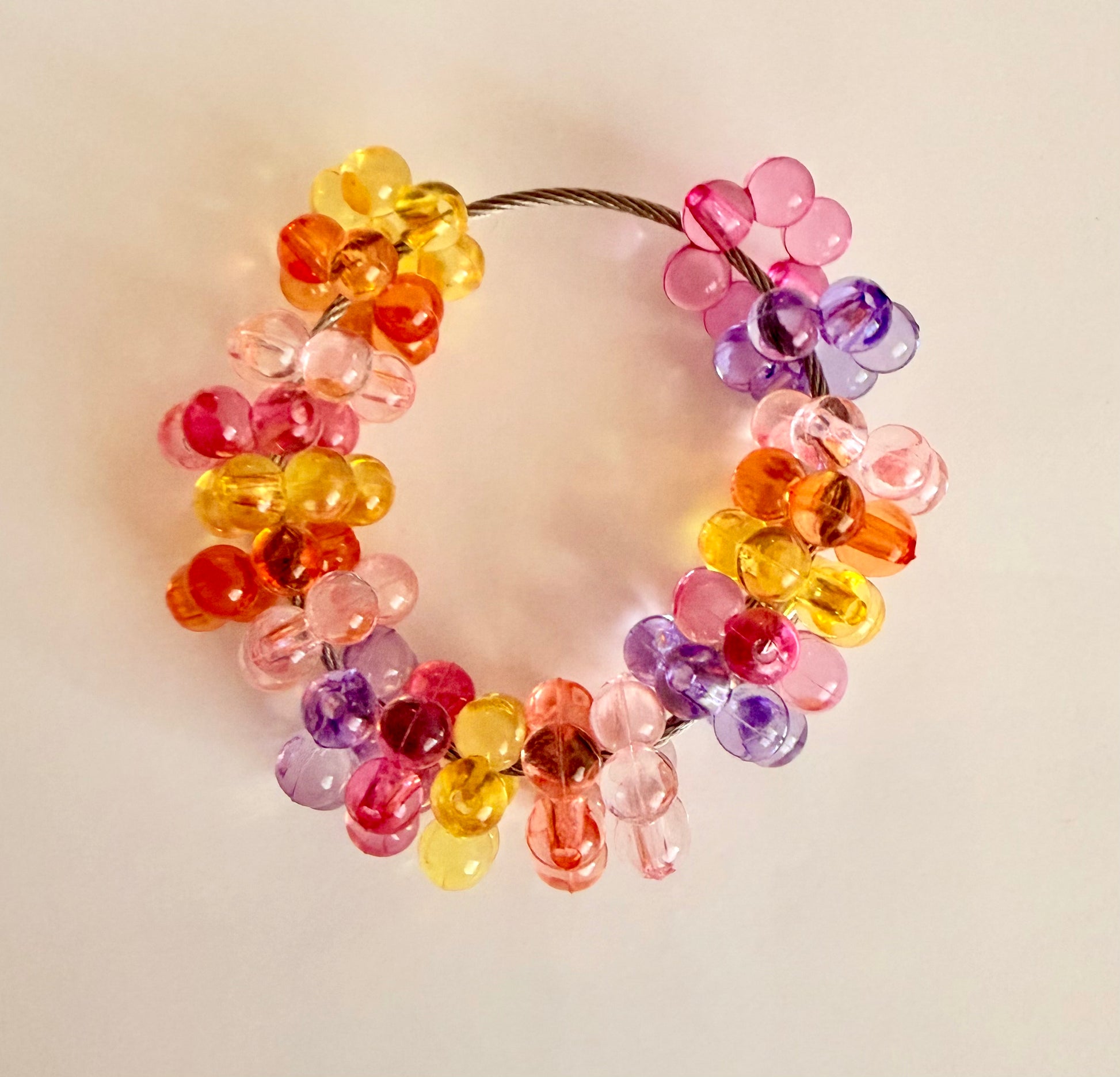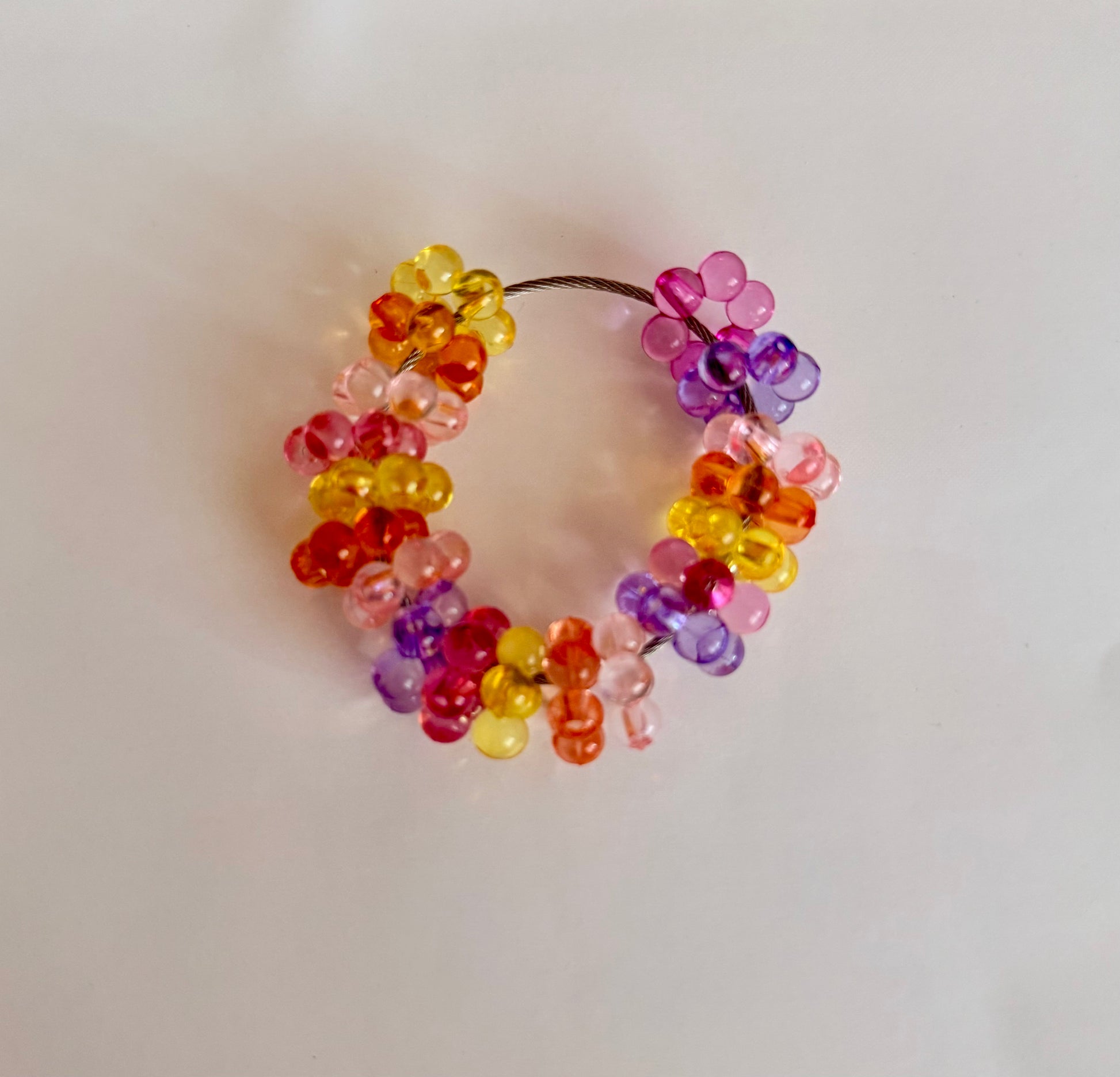 Summery colours, noisy in a good way and on a silver hoop. Made with bubble flower beads.