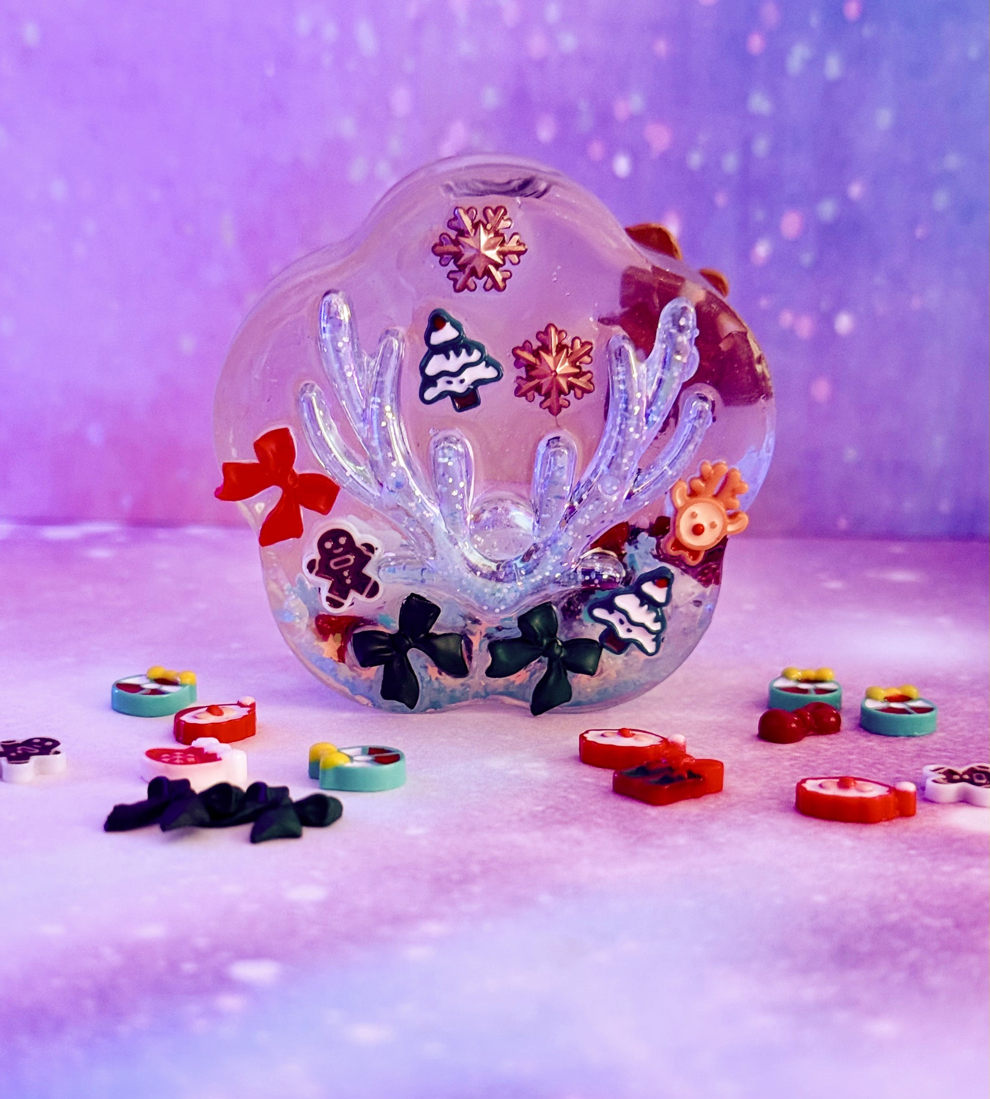 Decorated with a ginger bread person on the front, a glittery reindeer in the centre on the back, pain stim snowflakes and various Christmas related charms.