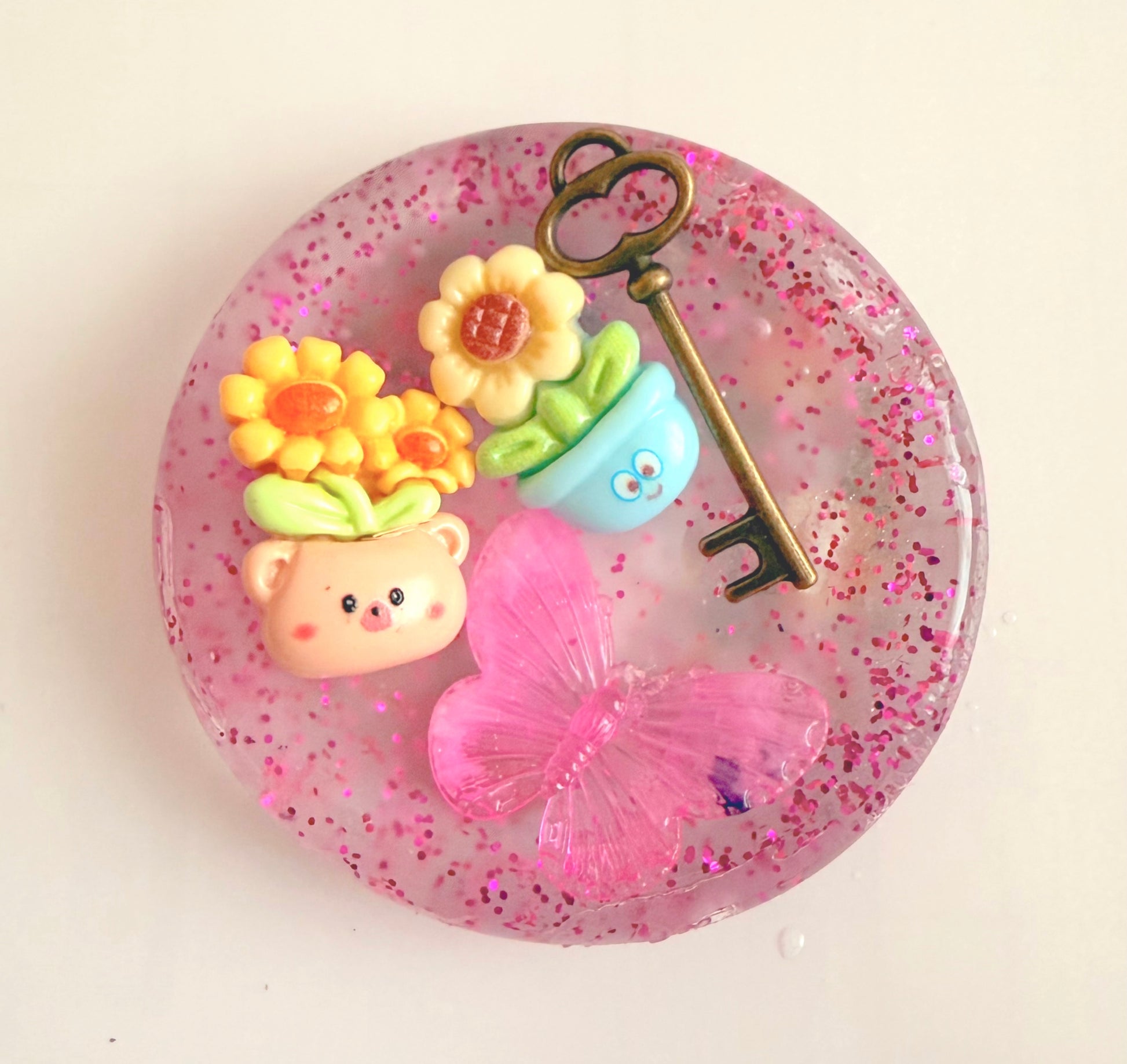 The image speaks for itself! On the back are floral charms that compliment the image.ย