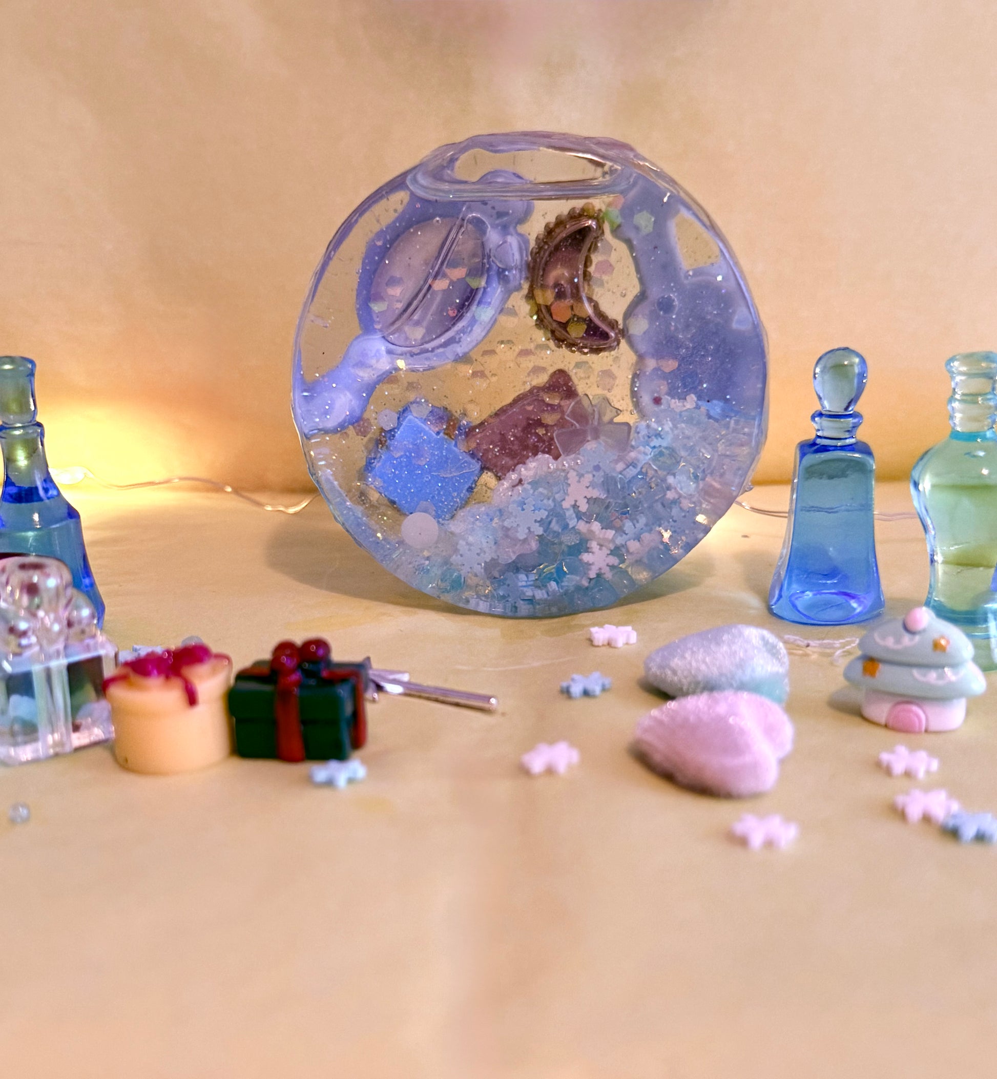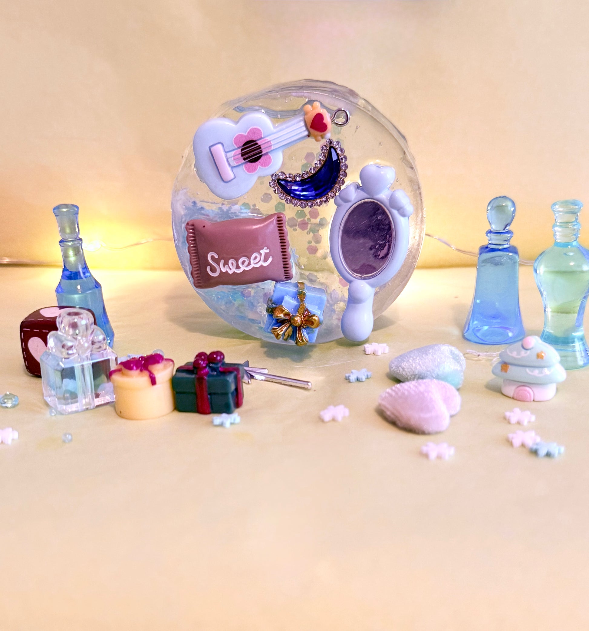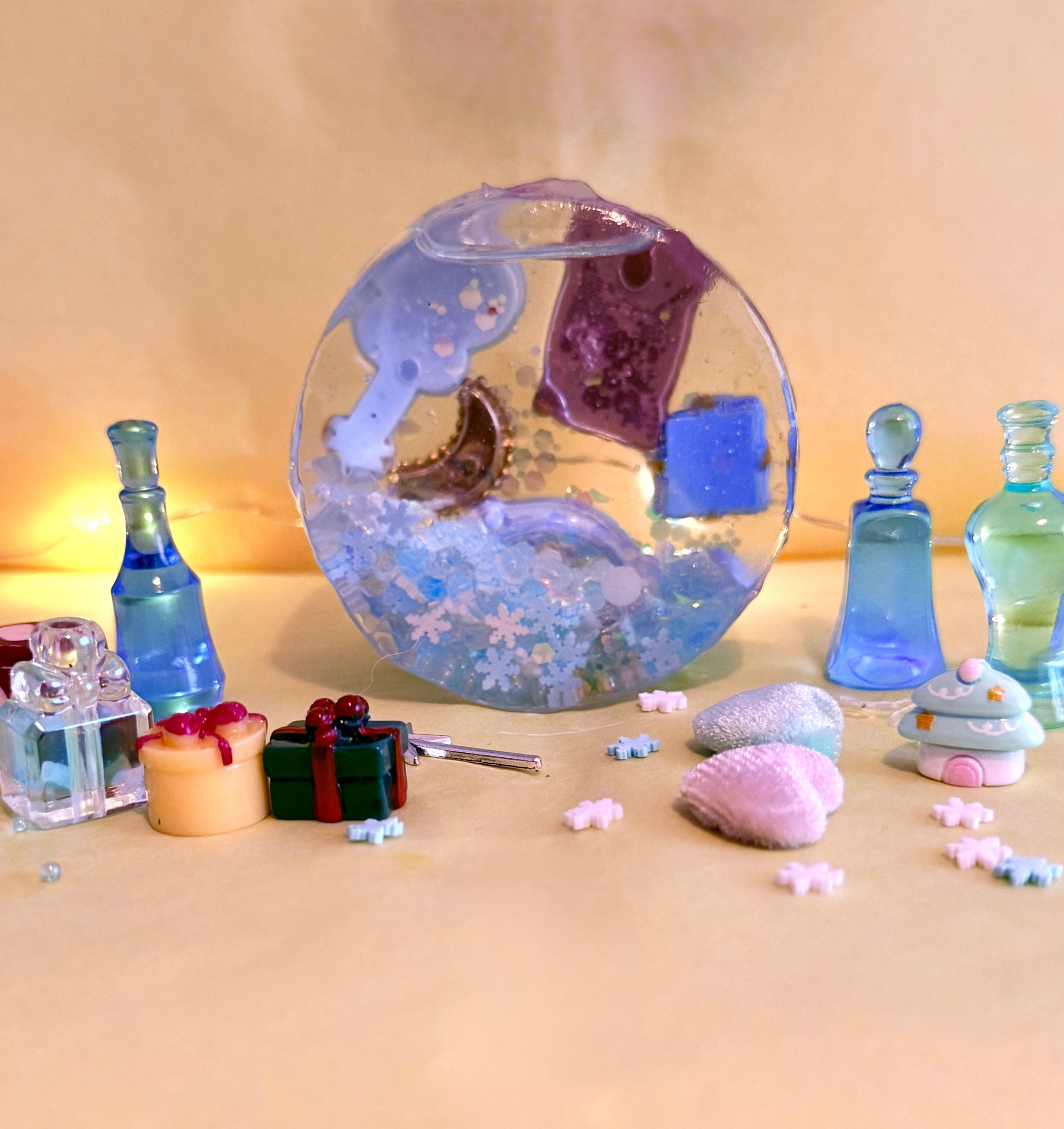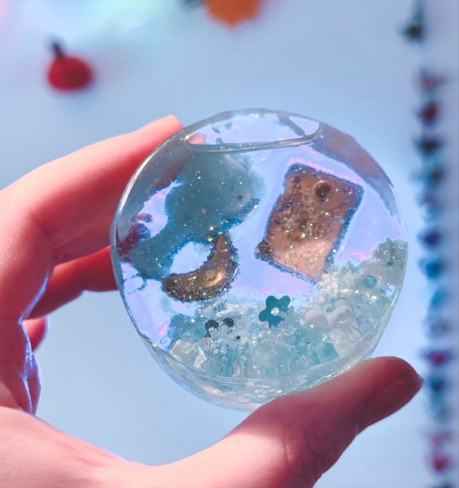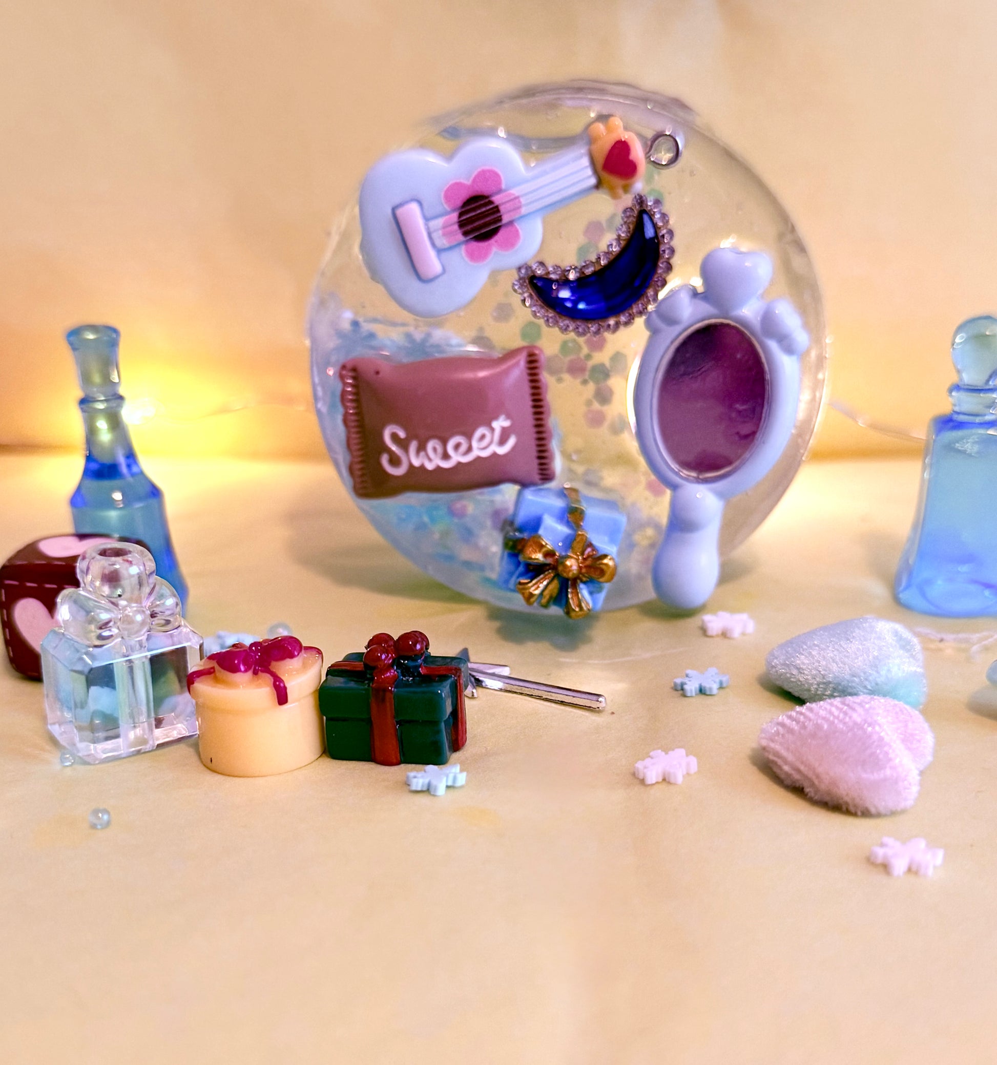 Filled with snowflakes, glass balls, glow in the dark glitter and pearls, this one is reminiscent of a crisp winters morning. On the back you’ll find charms I thought were related to winter and Christmas Day like a wishing bottle filled with enchanted dust and a magic wand.