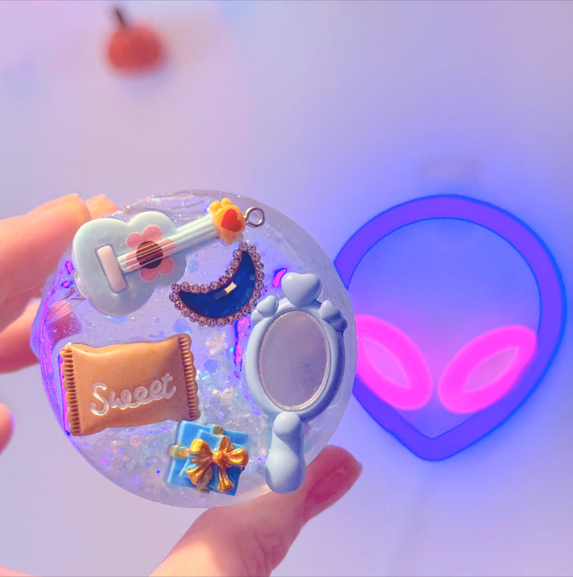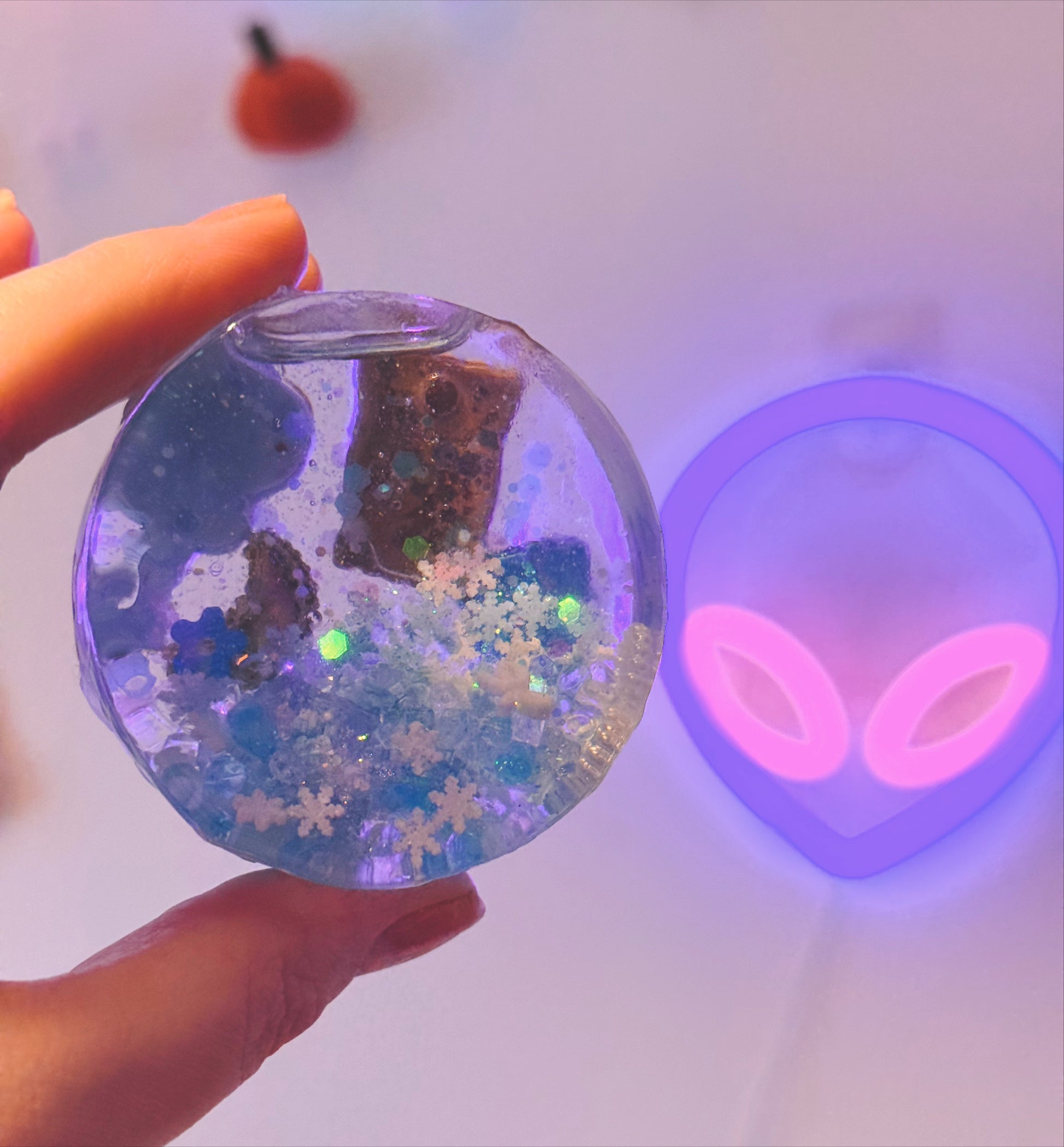 Glow in the dark glitter swirls and gently falls with snowflakes and pearls giving it a frosty look. The back is decorated with various charms